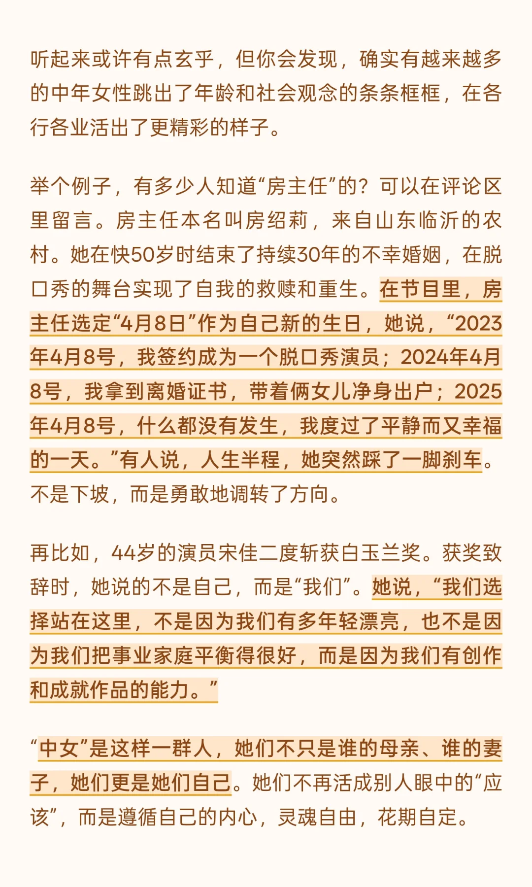 “中女”是这样一群人,她们不只是谁的母亲、谁的妻子,她们更是她们自己。她们不再活成别人眼中的“应该”,而是遵循自己的内心,灵魂自由,花期自定。