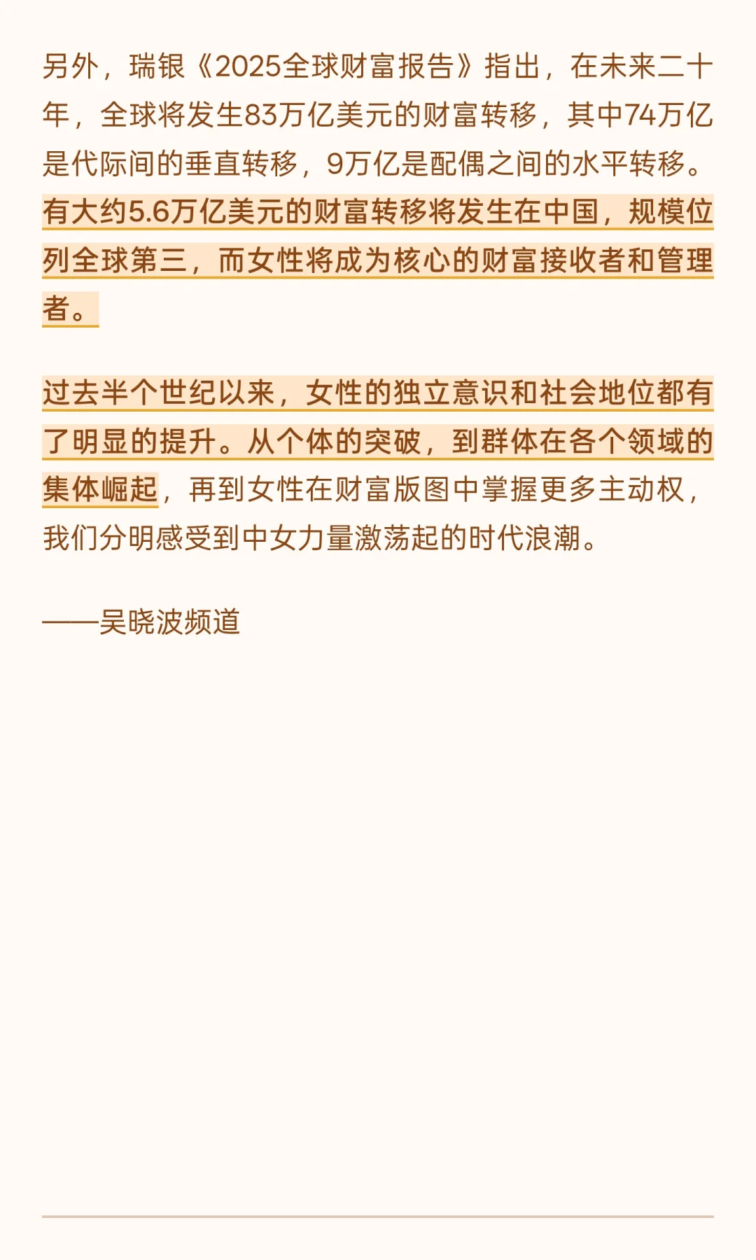 瑞银《2025全球财富报告》指出,在未来二十年,全球将发生83万亿美元的财富转移,其中74万亿是代际间的垂直转移,9万亿是配偶之间的水平转移。有大约5.6万亿美元的财富转移将发生在中国,规模位列全球第三,而女性将成为核心的财富接收者和管理者。