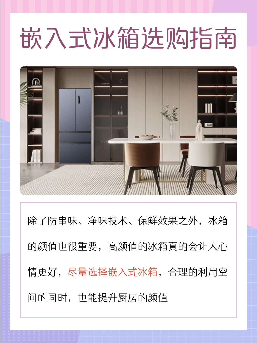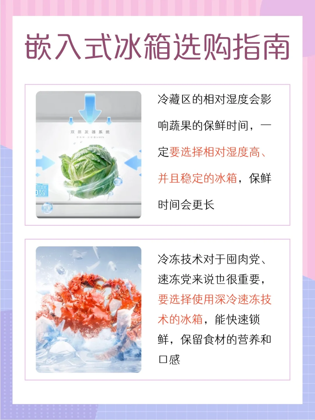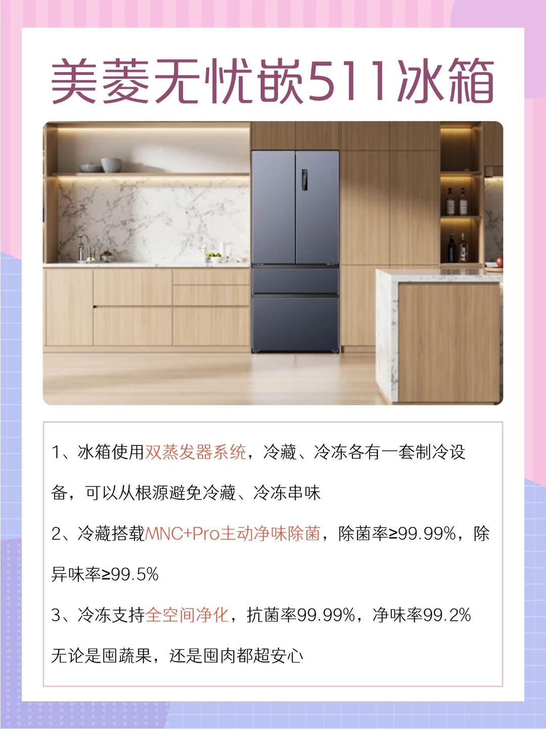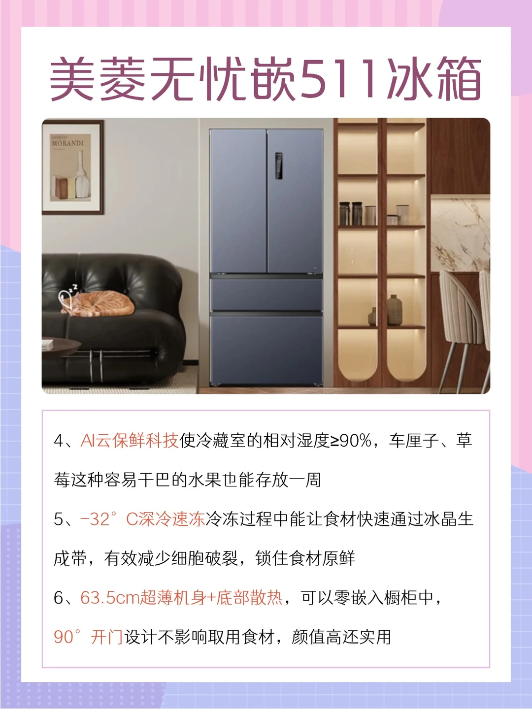 选冰箱别再只知道看颜值了❗❗一定要多关注防串味效果和保鲜能力,只有这两个方面做的好,才不会吃到羊肉味的西瓜🍑蔬果的保鲜时间也更长,不怕浪费!具体的选购指南我也放在下面了,大家跟着学就行啦👇 - 1⃣一定要选择双蒸发器系统的冰箱,冷藏、冷冻使用独立的制冷系统,能从根源防止两个区域串味 2⃣冷藏冷冻都要有净味功能,净味率越高越好,能有效避免冰箱中出现怪味 3⃣冰箱冷藏区相对湿度也不能低于90%,保鲜效果更好,蔬果不容易干巴发柴 除了防串味、净味、保鲜效果外,还有几个要注意的点👇 🔸冷冻区的温度最好低于-30℃,能更快的冻住食材,减少营养流失 🔸最好可以做成嵌入式冰箱,能让厨房的空间更规整 - 满足以上几点的冰箱尊嘟超好用的,我家的美菱无忧嵌511冰箱就是用上面的方法选出来的 - ✔搭载双蒸发器系统,冷藏、冷冻的制冷系统是独立的,从根源避免串味,有了它之后,再也没吃过榴莲味的肉和海鲜味的水果 ✔冷藏还搭载MNC+Pro主动净味除菌,除菌率≥99.99%,除异味率≥99.5%;冷冻支持全空间净化,抗菌率99.99%,净味率99.2%;火锅丸子、羊肉、海鲜、榴莲都能放心囤,不用担心有怪味 ✔AI云保湿能让冷藏区的相对湿度≥90%,车厘子、生菜这种容易干巴的蔬果,放一周依然鲜脆好吃,不用担心浪费食材 ✔-32°C深冷速冻技术能让肉类快速通过冰晶生成带,有效减少细胞破裂和营养流失,化冻后口感不会干巴发柴 ✔63.5cm超薄机身+底部散热,可以轻松嵌入橱柜,让厨房空间更规整 - 担心踩雷的姐妹可以闭眼冲美菱无忧嵌511冰箱🧊无论是防串味、异味,还是保鲜、冷冻鲜肉效果都很好👏美菱这种大品牌,售后服务也有保障,用着超安心!