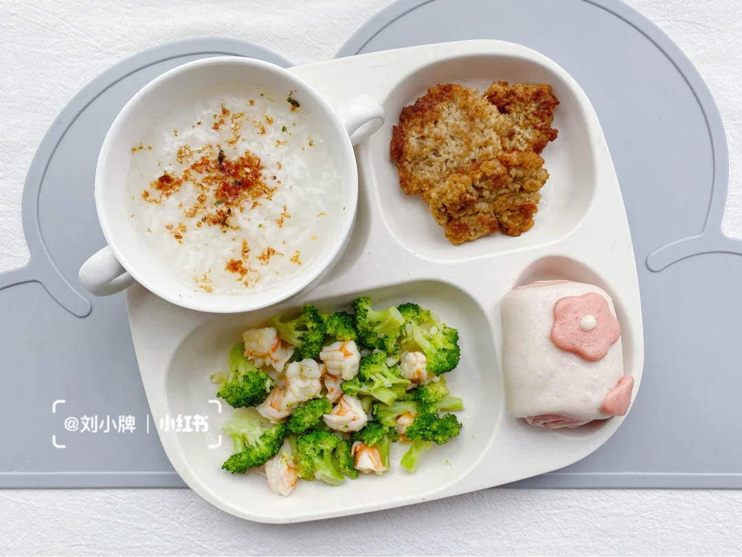 🔹西兰花炒虾仁➕牛肉饼➕花朵馒头➕大米粥🔹