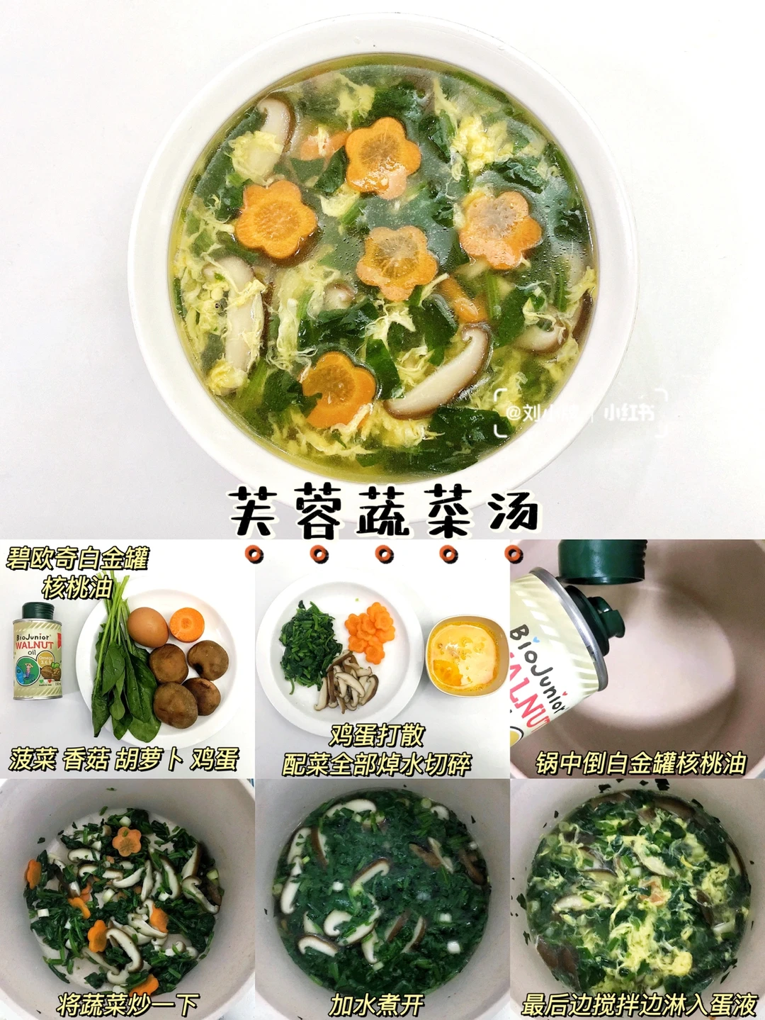 菠菜、香菇、胡萝卜、鸡蛋、碧欧奇白金罐核桃油