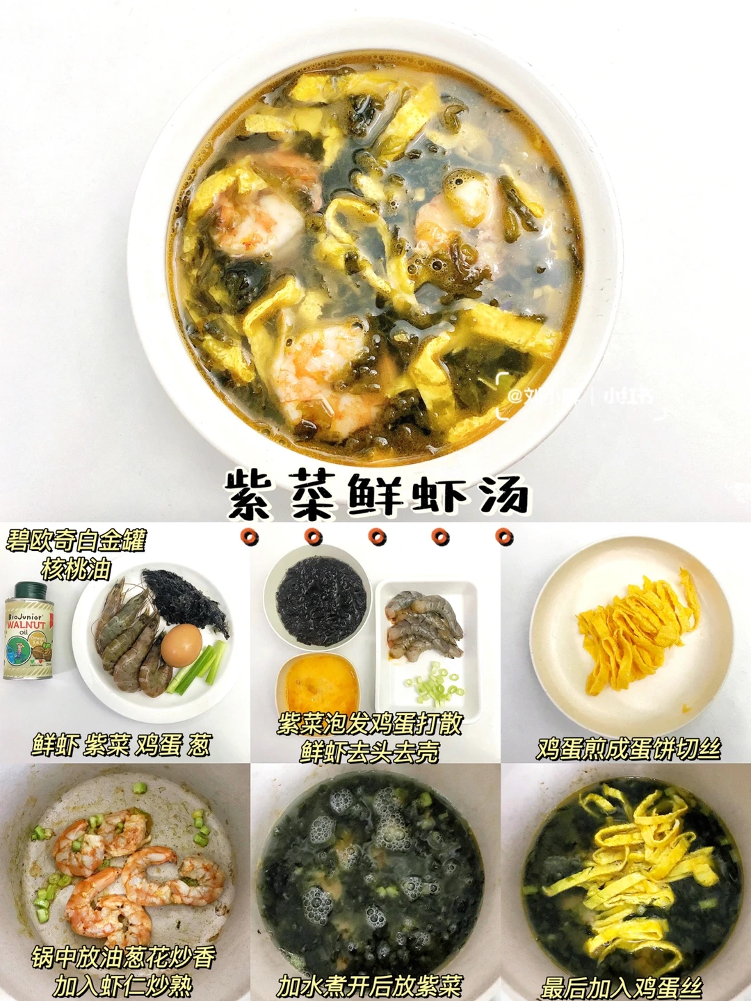 1.鲜虾去头去壳,紫菜泡发,鸡蛋打散剪成蛋皮切丝备用。