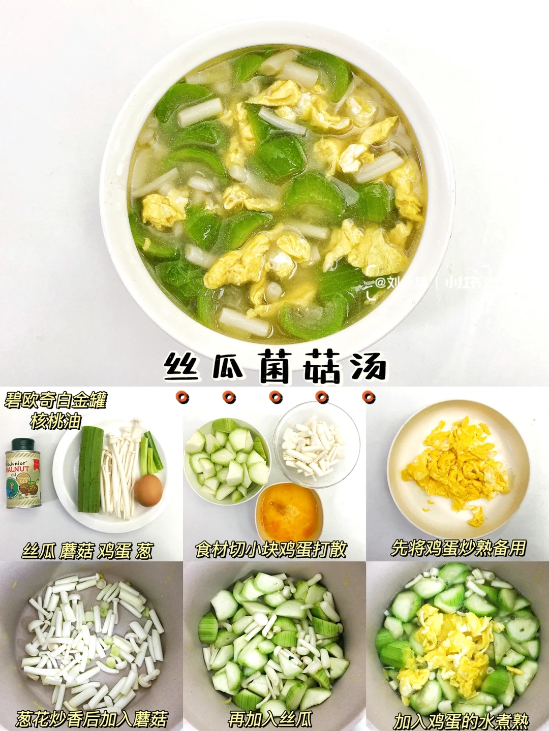 2.锅中放油将葱花爆香后加入蘑菇和丝瓜翻炒,再加入鸡蛋和水煮开即可。