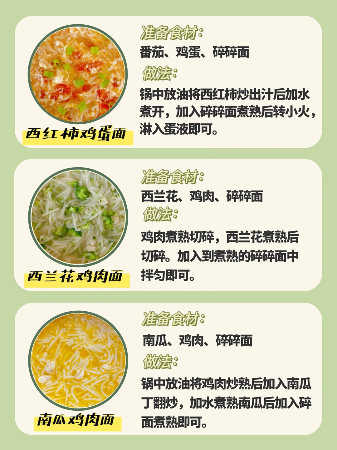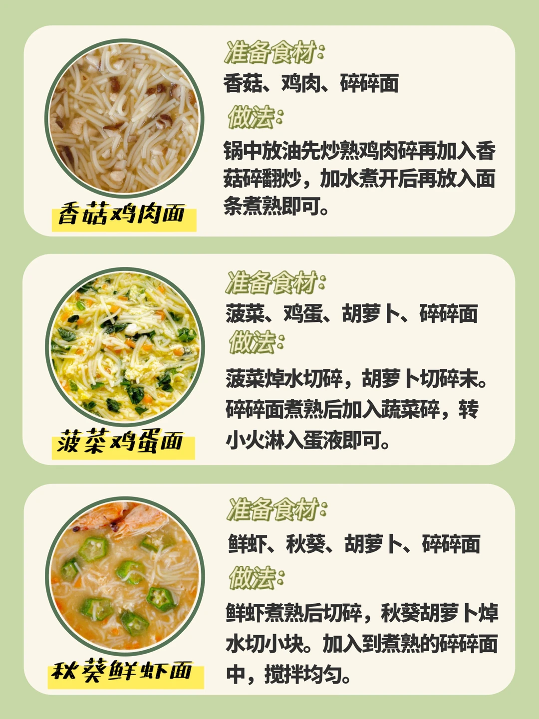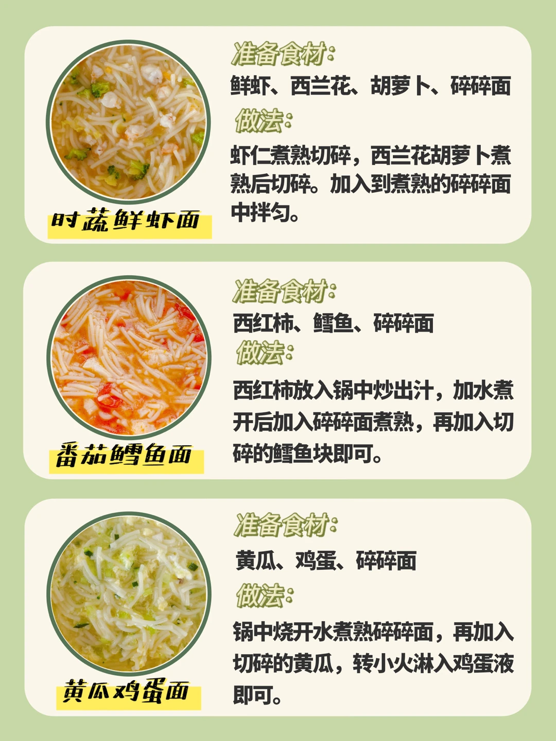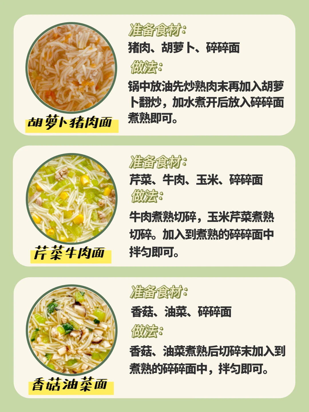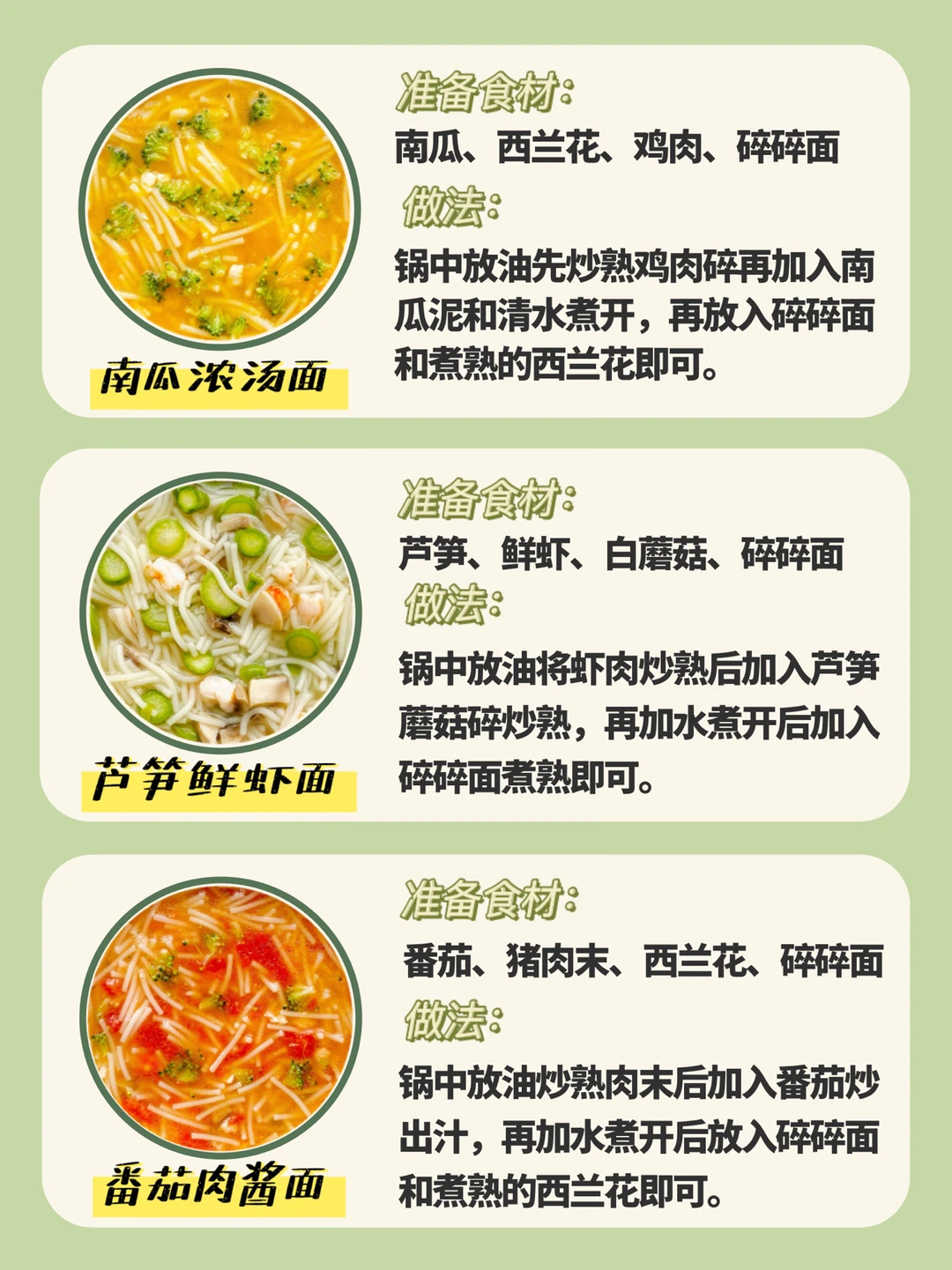 ☑️面条的种类很多,宝宝可以先从碎碎面开始,出牙之后再慢慢添加长直面或者造型面等。