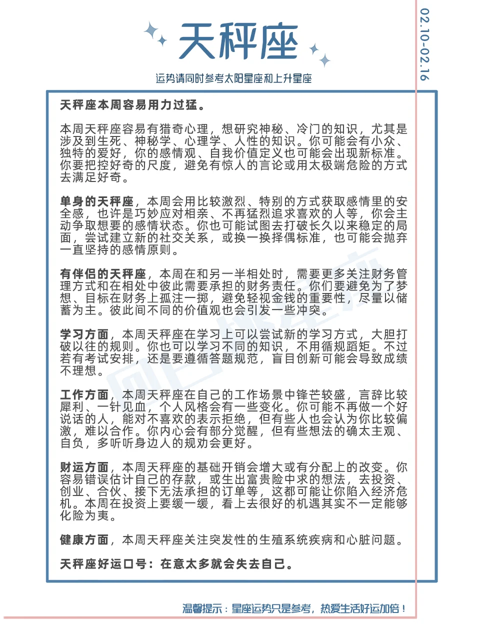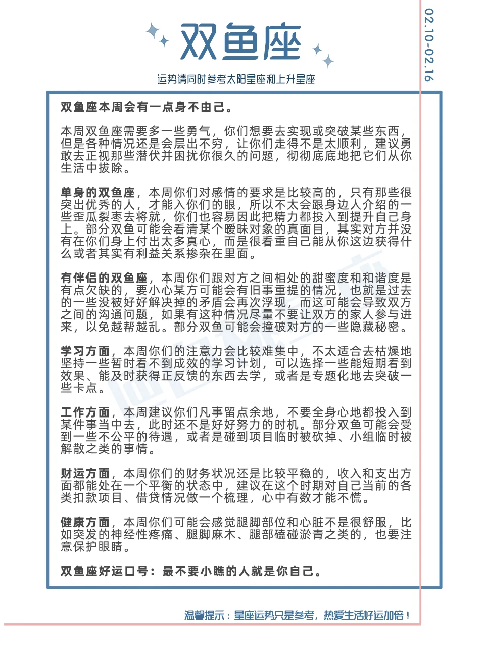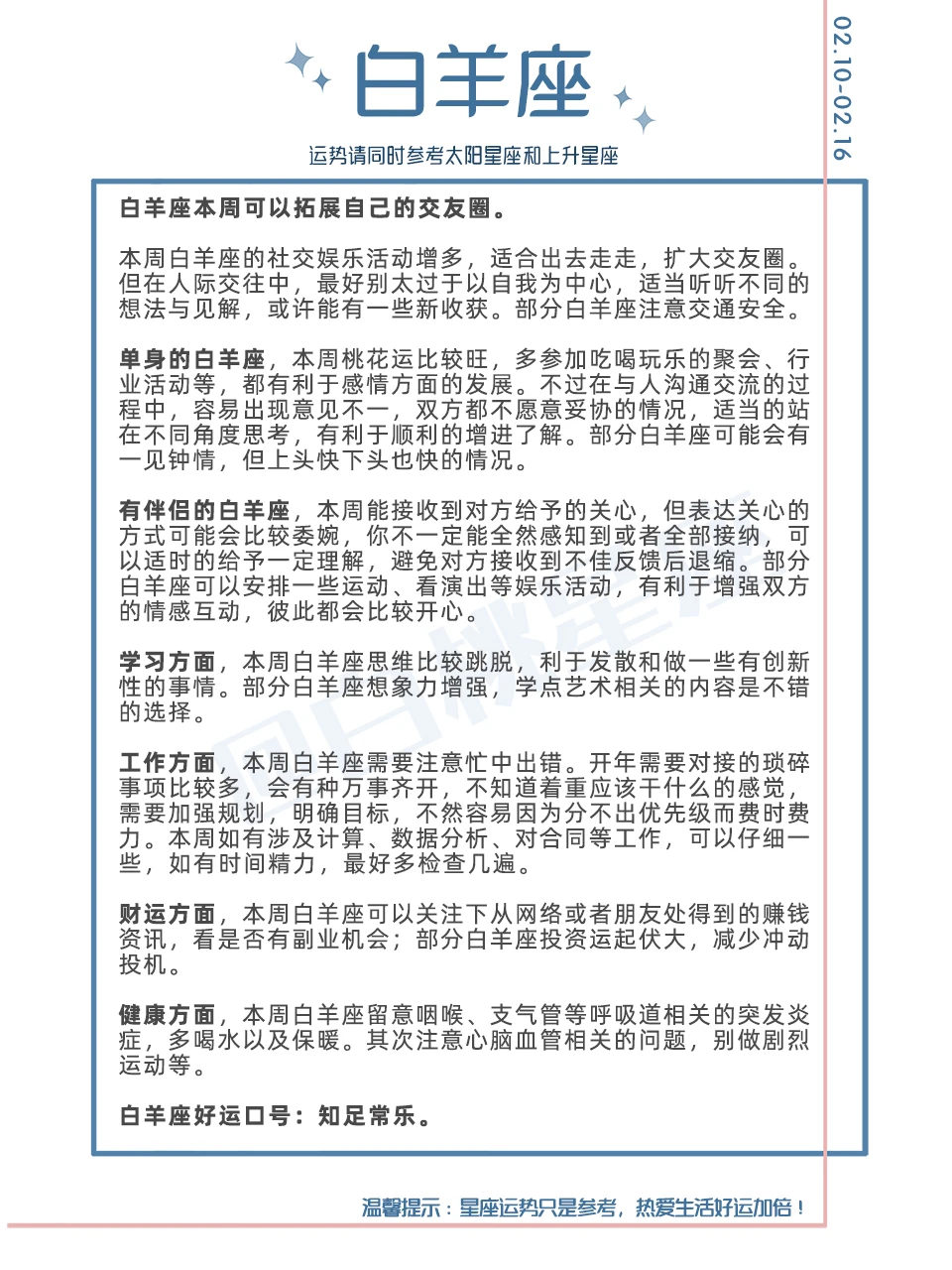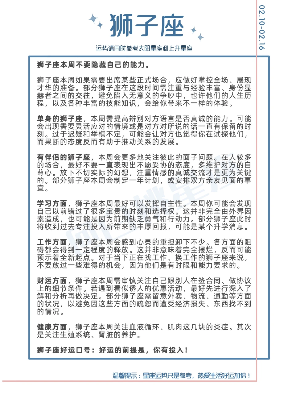 快带上你的好运口号领取本周好运吧~ 温馨提示:星座运势只是参考,热爱生活好运加倍! 星座 星座运势 十二星座