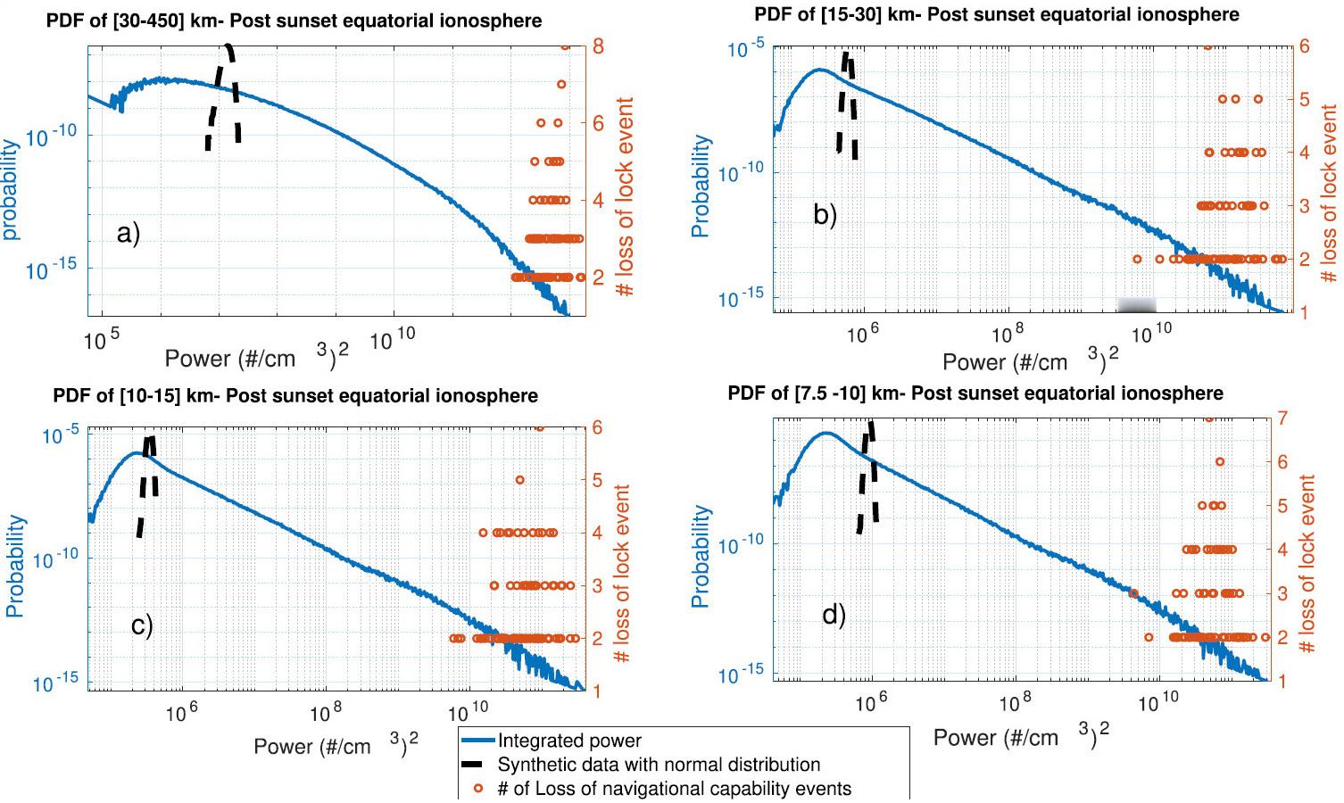 【Swarm星座解秘赤道地区GNSS中断的数学规律】欧洲航天局Swarm卫星群最新研究揭示,全球导航卫星系统(GNSS)信号丢失事件遵循重尾幂律分布,而非传统认知中的正态分布。该发现为预测极端空间天气事件对导航系统的风险提供了全新数学框架。研究基于Swarm卫星实测数据,系统分析了GNSS信号中断事件的统计分布特征。结果显示,事件分布呈现典型的幂律行为:小型信号扰动频繁发生,中等规模事件数量递减,而大型中断事件的发生概率虽低却衰减缓慢。这种分布形态与正态分布(钟形曲线)形成鲜明对比——后者对极端事件的预测概率极低,几乎可忽略不计。在幂律分布框架下,极端事件并非统计异常值,而是该分布的内在组成部分。图表中橙色点群代表的GNSS信号丢失事件集成功率,集中分布在概率曲线的远右尾部,这一区域正是罕见但高影响事件的聚集区。此类事件虽发生频率低,却构成了实际应用中的主要风险来源。该幂律分布具有尺度不变性特征,即在不同时间尺度或测量单位下,分布形态保持自相似,表明电离层扰动不存在单一的"典型"强度。这一特性解释了为何偶发的极端扰动能在实际应用中占据主导地位,尽管绝大多数时段的观测数据看似平静。该研究成果已发表于《空间天气与空间气候杂志》(2025年第15卷30期),论文标题为《电离层密度波动集成功率的间歇性特征》,由Ghadjari、Knudsen、Balasis与Skone共同完成。研究为电离层电动力学建模和GNSS系统可靠性评估提供了重要的统计物理基础,对提升空间天气预报能力具有直接应用价值。