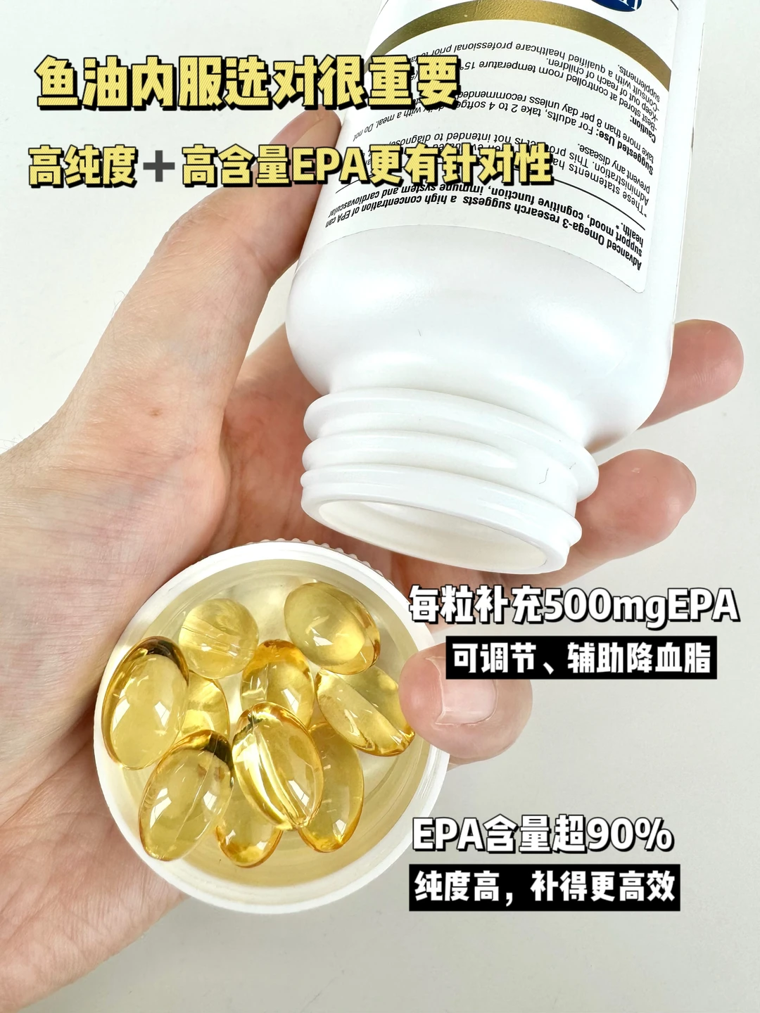 除了少油少盐、戒烟戒酒,还可以考虑吃鱼油维持心脑血管能量,给身体“加油”!吃鱼油主要是吃里面的Omega-3,里面有DHA+EPA,其中EPA有调节、辅助降血脂,增强抵抗力、减轻血管、心脏的负担的作用,长期吃EPA对于改善睡眠和情绪也有一定作用,所以我们在选鱼油内服的时候不仅要看纯度和安全性,还要看EPA的含量~