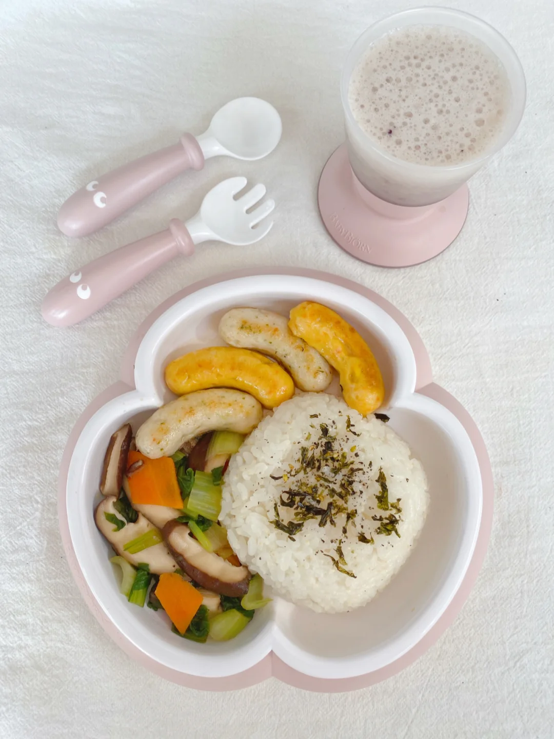 🍄香菇油菜+煎鸡肉肠鳕鱼虾肠+胚芽米饭