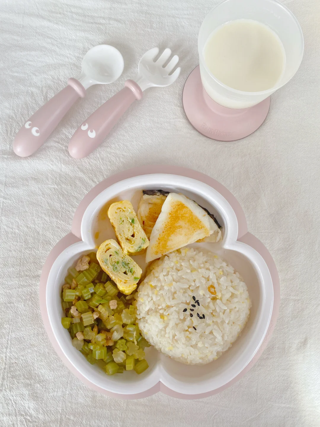 🐟肉沫芹菜+厚蛋烧+香煎银鳕鱼+胚芽米饭