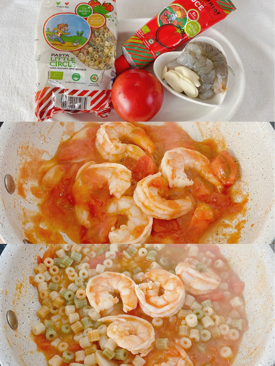 2.用底油炒香蒜片后放入西红柿炒出汤汁,再加入虾仁和意面,放一点番茄酱调味。