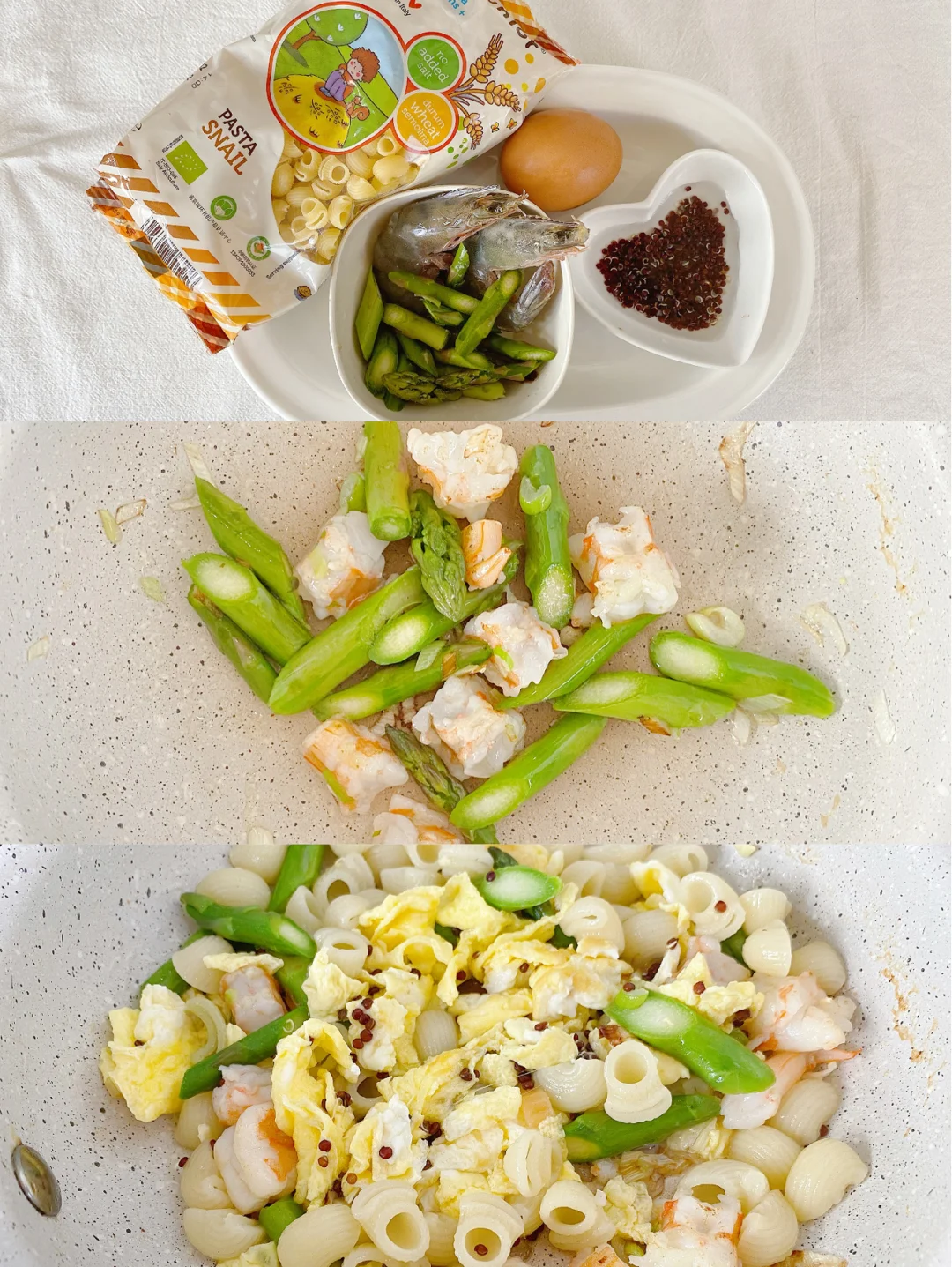 芦笋,虾仁,鸡蛋,藜麦,意面,小葱