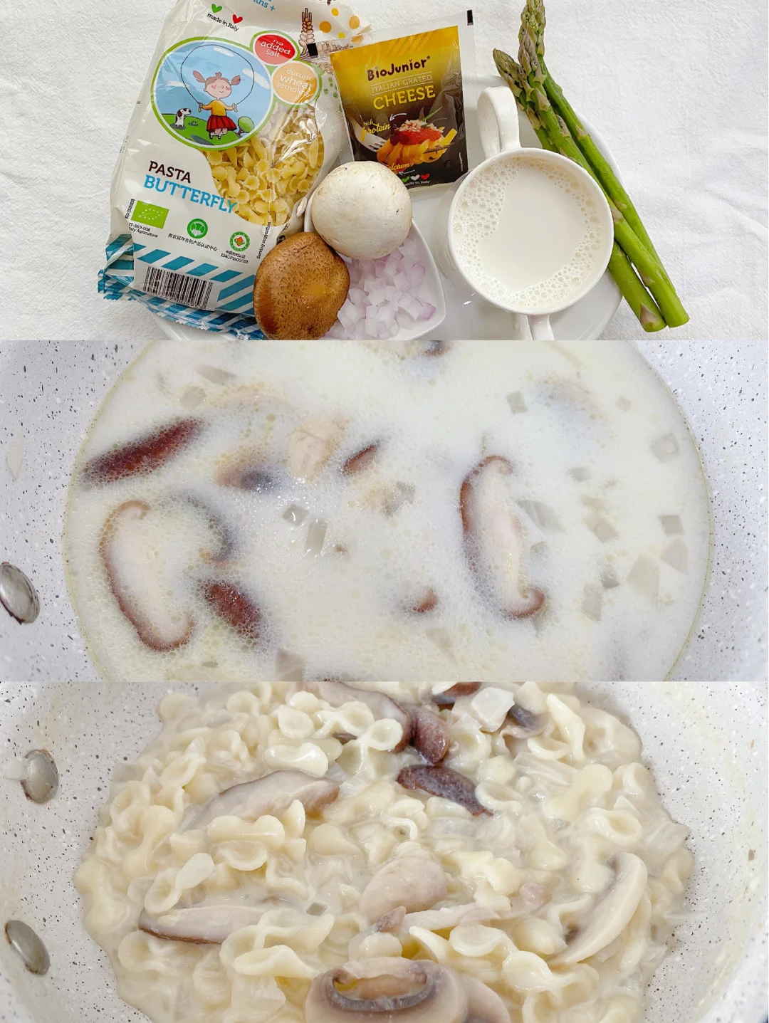 口蘑,香菇,洋葱,芦笋,配方奶或牛奶,意面,芝士粉