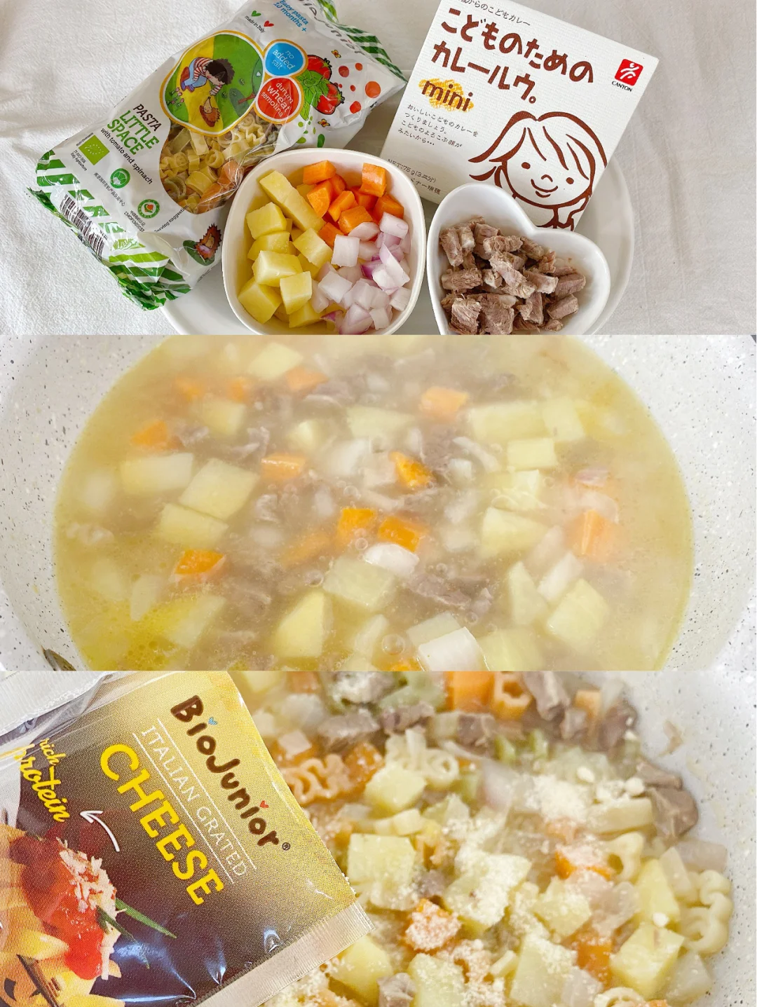 2.锅中放油炒香洋葱碎,之后加入土豆胡萝卜翻炒,再加入牛肉,1/8咖喱块和水炖煮至食材全部熟透加入意面翻拌均匀。