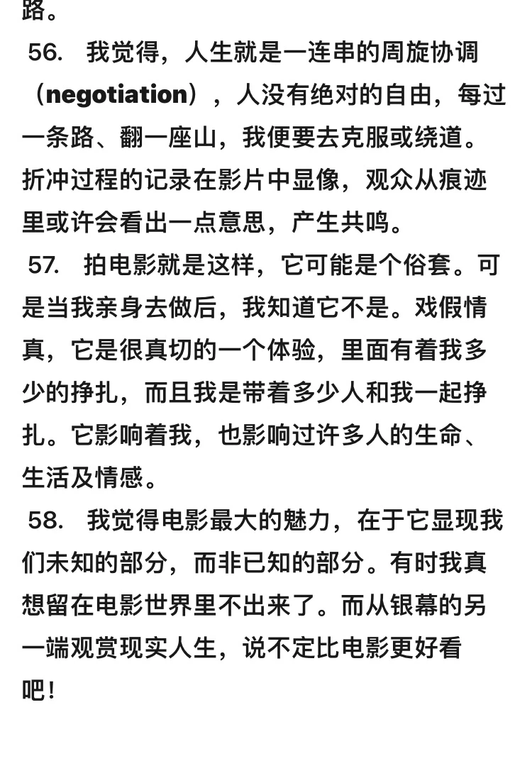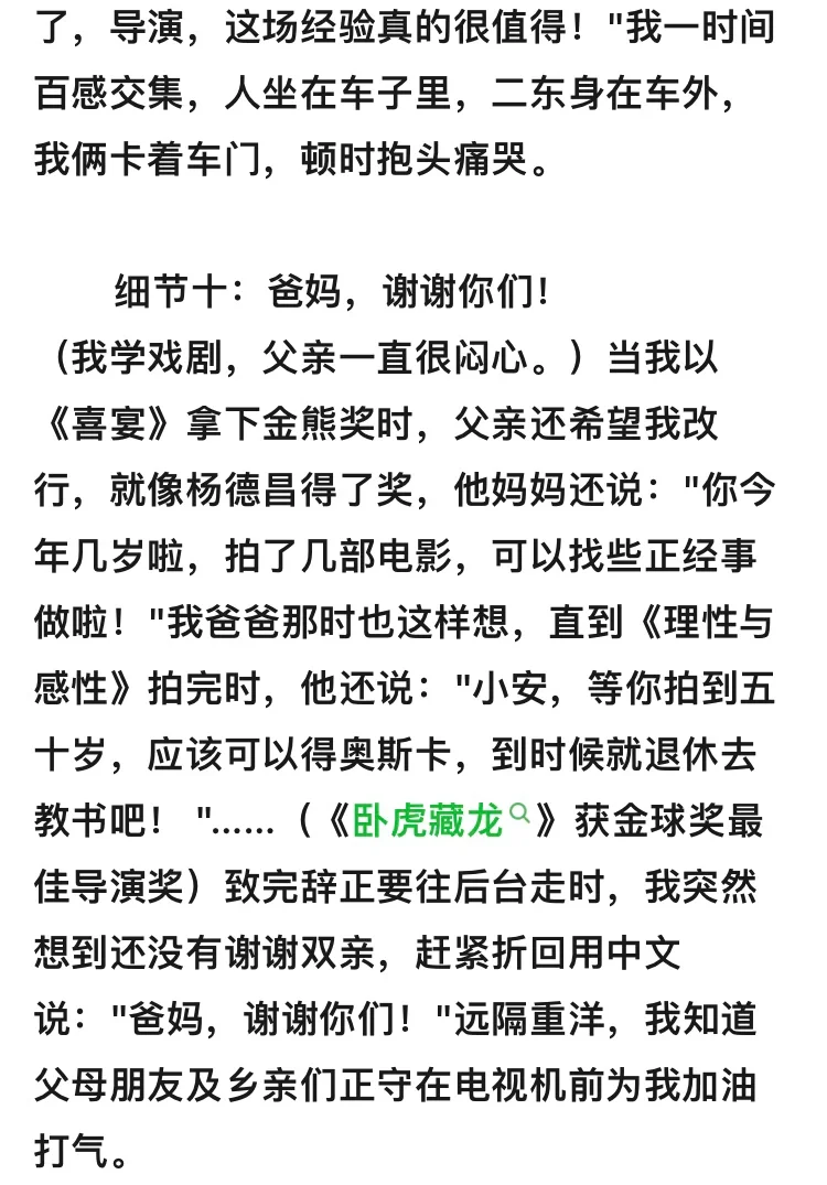 当我以《喜宴》拿下金熊奖时,父亲还希望我改行,就像杨德昌得了奖,他妈妈还说:"你今年几岁啦,拍了几部电影,可以找些正经事做啦!"我爸爸那时也这样想,直到《理性与感性》拍完时,他还说:"小安,等你拍到五十岁,应该可以得奥斯卡,到时候就退休去教书吧! "……(《卧虎藏龙》获金球奖最佳导演奖)致完辞正要往后台走时,我突然想到还没有谢谢双亲,赶紧折回用中文说:"爸妈,谢谢你们!"远隔重洋,我知道父母朋友及乡亲们正守在电视机前为我加油打气。