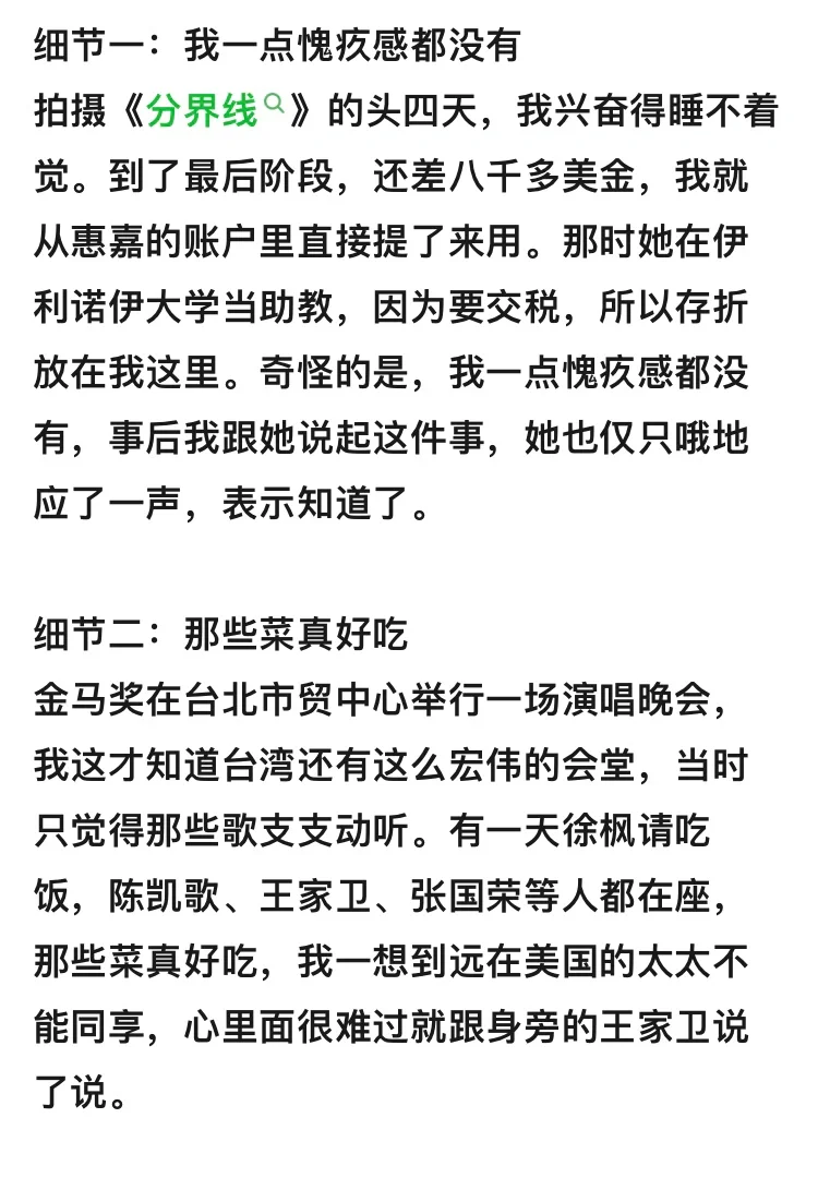 拍摄《分界线》的头四天,我兴奋得睡不着觉。到了最后阶段,还差八千多美金,我就从惠嘉的账户里直接提了来用。那时她在伊利诺伊大学当助教,因为要交税,所以存折放在我这里。奇怪的是,我一点愧疚感都没有,事后我跟她说起这件事,她也仅只哦地应了一声,表示知道了。