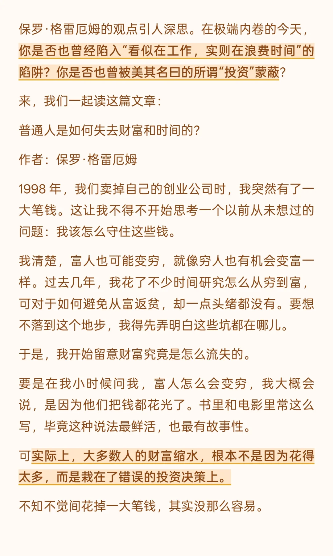 保罗·格雷厄姆是YC联合创始人,是山姆·奥特曼创业导师。他说:\n\t\n1,时间最大的浪费不是去玩,而是把时间投入到回报率很低的\"伪工作\"中。\n\t\n2,财富流失的最大陷阱不是挥霍,而是错误的投资。享乐会引起警觉,而投资不会。\n\t\n3,在现代社会,真正的陷阱往往披着“高尚”的外衣。\n\t\n保罗·格雷厄姆这篇文章引人深思。在极端内卷的今天,你是否也曾经陷入“看似在工作,实则在浪费时间”的陷阱?你是否也曾被美其名曰的所谓“投资”蒙蔽?\n