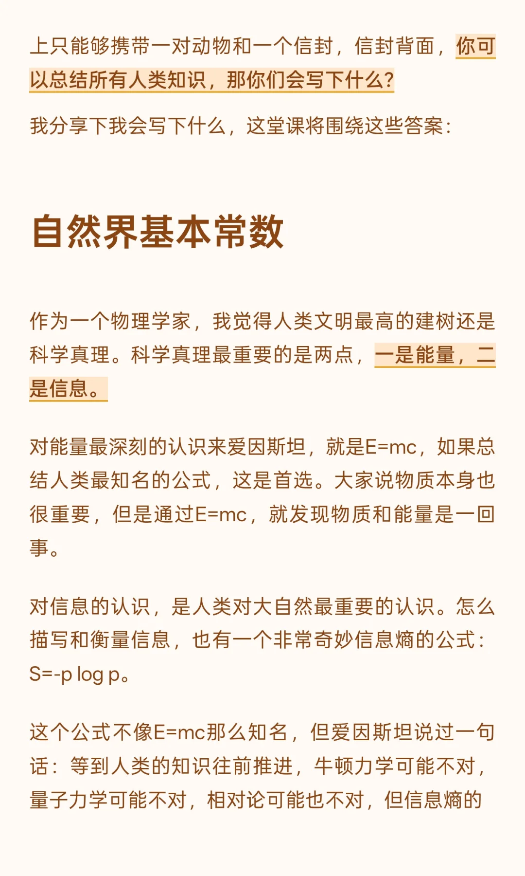 “我想以一个问题开始:假设世界末日到了,诺亚方舟上只能够携带一对动物和一个信封,信封背面,你可以总结所有人类知识,那你们会写下什么?”