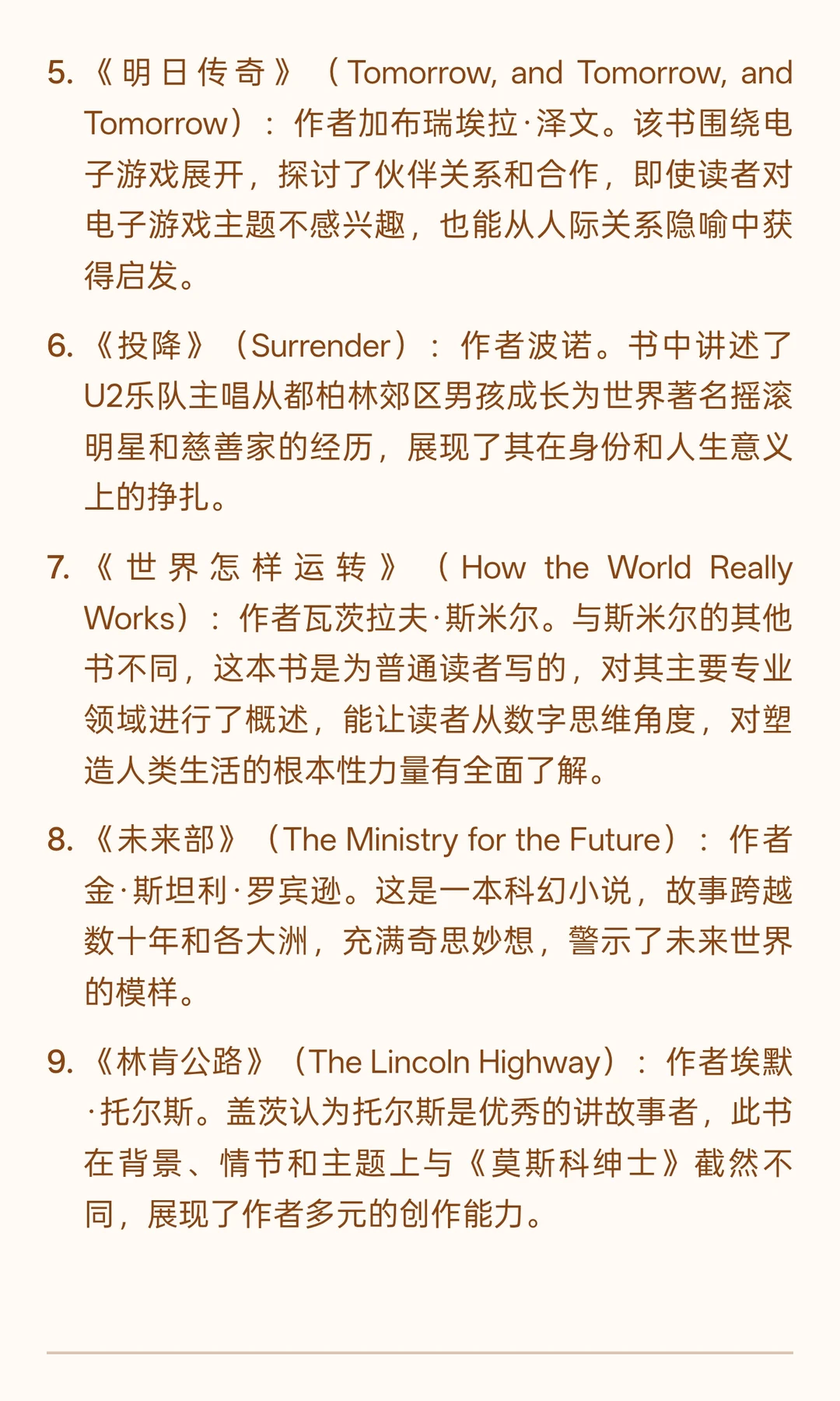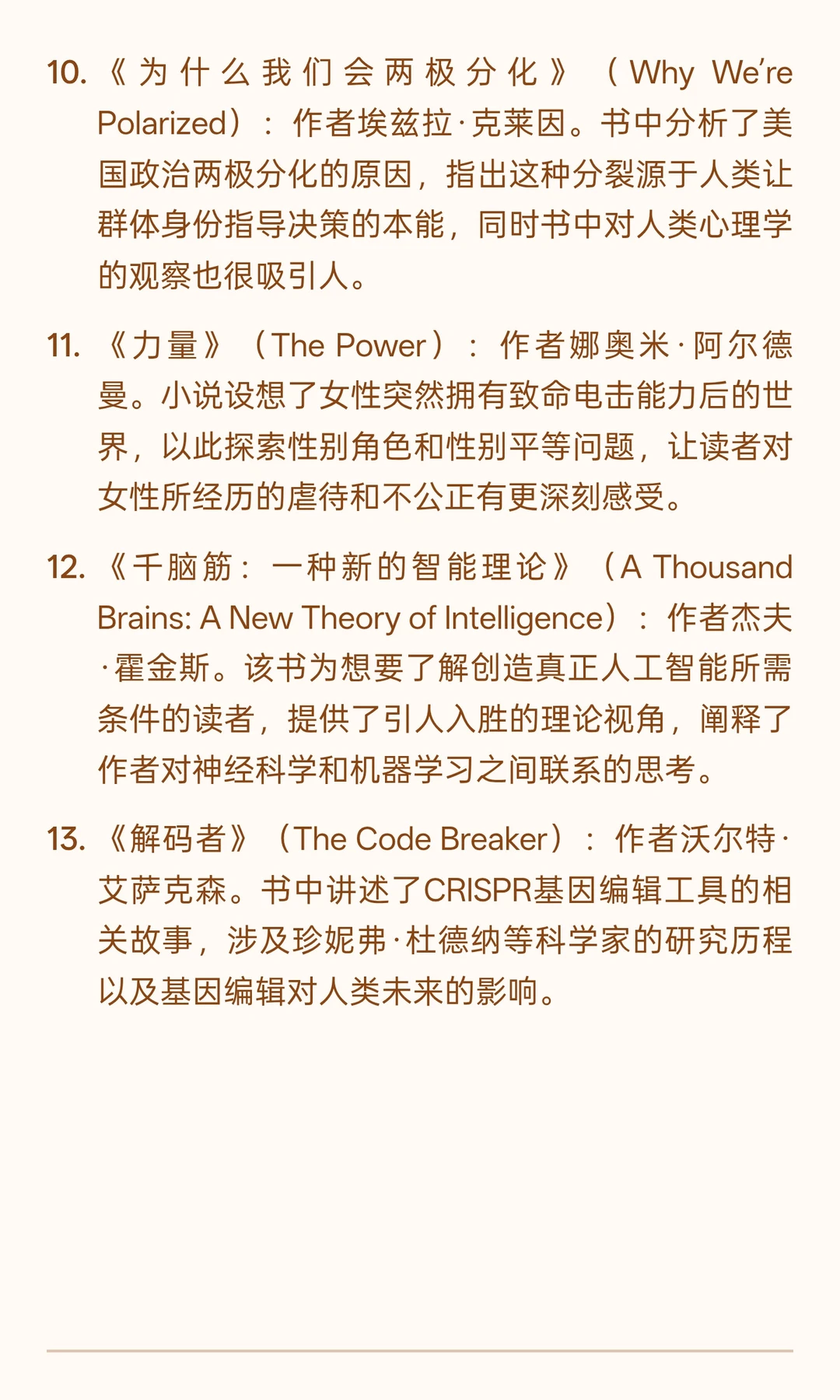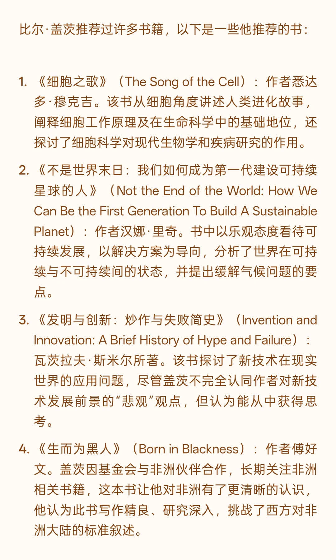 他也乐于向他人分享自己的阅读感悟和推荐书籍。他推荐的书籍涵盖了众多领域,从探讨人类干预大自然手段的小说,到剖析像通用电气这样的大公司兴衰的作品,再到探索人类免疫系统的科普读物等。他推荐时会详细阐述书籍的精彩之处和对自己的启发,希望更多人能通过阅读获得知识和力量 。