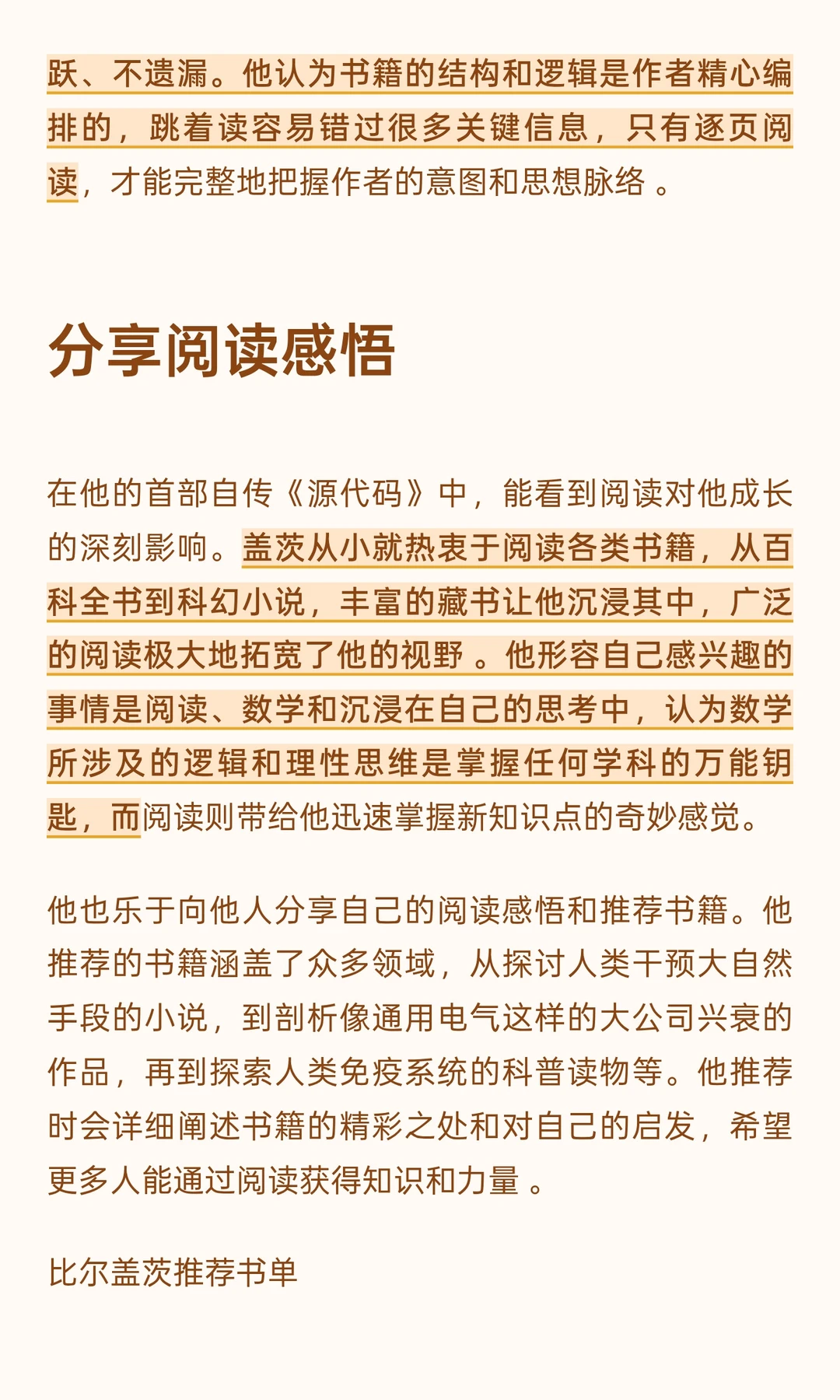 在他的首部自传《源代码》中,能看到阅读对他成长的深刻影响。盖茨从小就热衷于阅读各类书籍,从百科全书到科幻小说,丰富的藏书让他沉浸其中,广泛的阅读极大地拓宽了他的视野 。他形容自己感兴趣的事情是阅读、数学和沉浸在自己的思考中,认为数学所涉及的逻辑和理性思维是掌握任何学科的万能钥匙,而阅读则带给他迅速掌握新知识点的奇妙感觉。