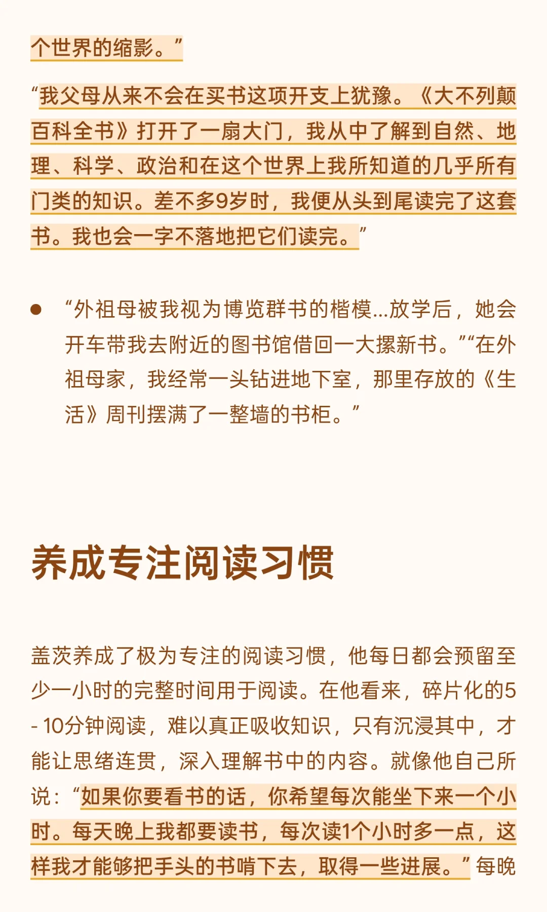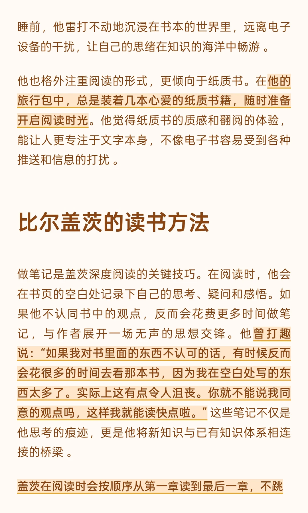 比尔·盖茨通过阅读拓宽视野,培养专注习惯,尤其偏爱纸质书。他每日阅读一小时,做笔记,深入思考。