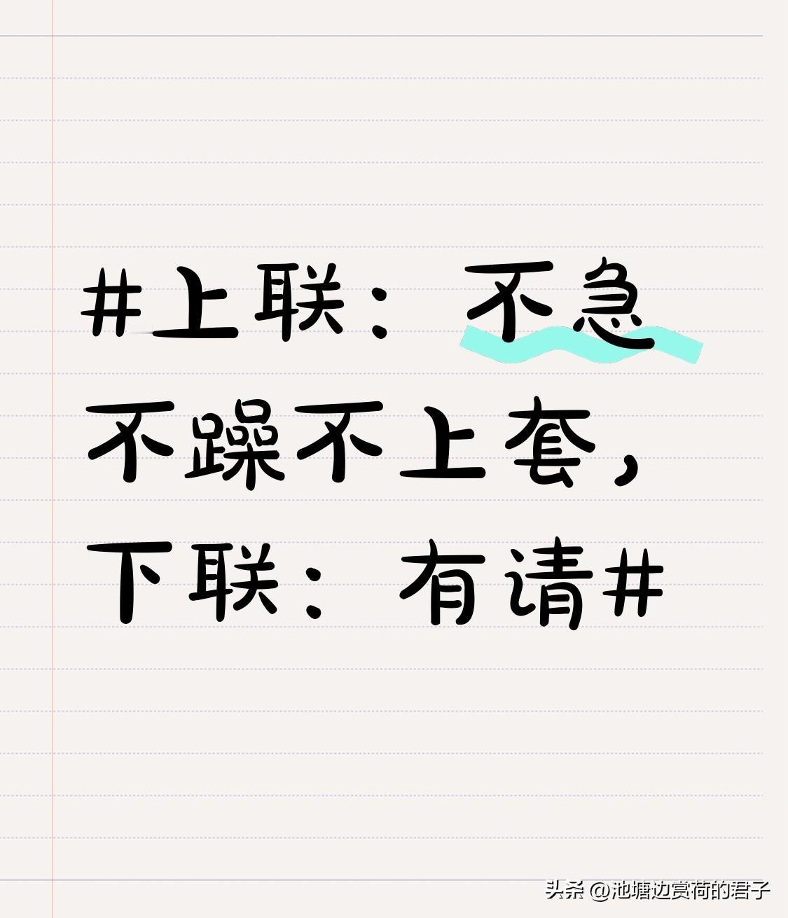 看到“不急不躁不上套”这个上联,我脑海里第一反应下联可以是“不骄不馁不迷途”。 “不急不躁”体现的是面对事情冷静平和的态度,“不骄不馁”则强调在取得成绩或遭遇挫折时都能保持平稳心态。“不上套”是不被外界的陷阱迷惑,“不迷途”是在人生道路上不迷失方向。 对联这玩意儿,真的很有魅力。像古代才女出“踏破磊桥三块石”,书生对“分开出路两重山”,就促成了一段佳话。一个好的下联,说不定也能带来意想不到的缘分呢。