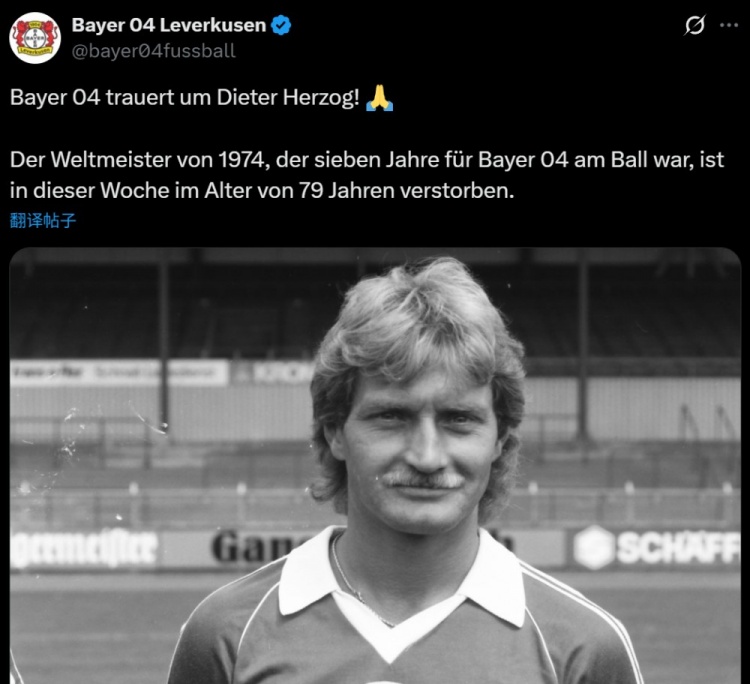 在官方公告中,勒沃库森声明:“俱乐部对迪特·赫尔佐格的逝世表示哀悼!他曾效力于勒沃库森7年,这位1974年世界杯冠军队成员于本周去世,享年79岁。”