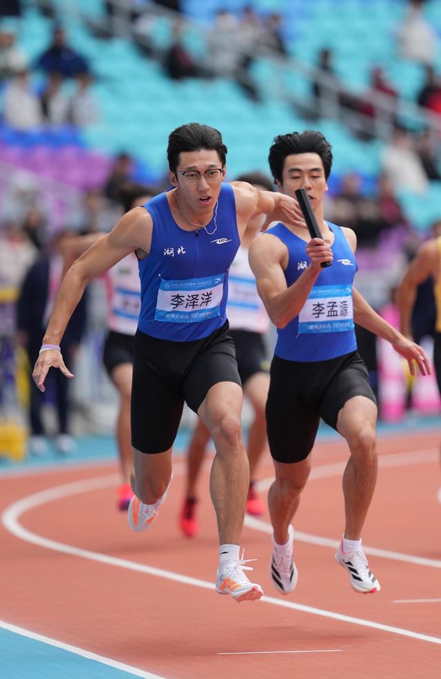 11月20日,湖北队第二棒选手李泽洋(左)与第一棒选手李孟源在比赛中交接棒。湖北队晋级决赛。当日,第十五届全国运动会田径男子4x100米接力预赛在广州举行。新华社记者李一博摄