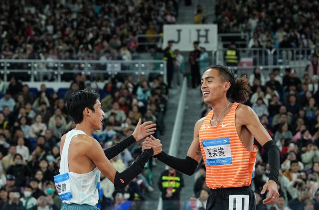 新华社照片,广州,2025年11月20日11月20日,广西队选手刘德助(左)和浙江队选手奚枭横在比赛后相互致意。他们分别获得冠军和季军。当日,第十五届全国运动会田径男子1500米决赛在广州举行。新华社记者江汉摄