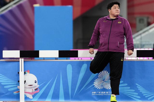 11月16日,河北队选手巩立姣在比赛前。当日,第十五届全国运动会田径女子铅球决赛在广州举行。新华社记者李一博摄