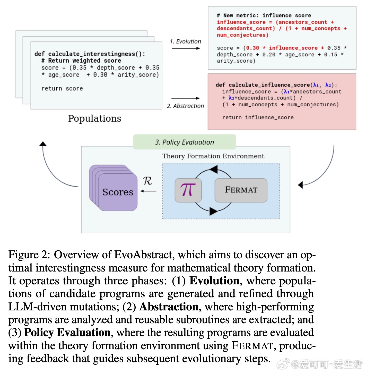 [LG]《Learning Interestingness in Automated Mathematical Theory Formation》G Tsoukalas, R Saha, A Thakur, S Reguyal... [UT Austin] (2025) 自动数学理论形成:学习“有趣性”引导数学发现人工智能在数学自动发现领域迈出两大关键步伐:1. Fermat环境:首次将数学概念发现与定理证明建模为马尔可夫决策过程(MDP),通过符号化动作实现数学理论的自动构建与验证,打造开放式理论探索平台。2. EvoAbstract算法:创新性引入基于大型语言模型(LLM)的进化程序合成和抽象学习,自动生成“有趣性”度量函数,指导理论发现过程,显著优于传统手工设计的启发式指标。核心贡献:- Fermat支持定义、猜想、证明等动作,构建数学知识图谱,利用Z3定理证明器验证猜想。- 有趣性被视为内在奖励函数,EvoAbstract通过多岛模型迭代进化,并周期性抽象高效子程序,促进模块化与复杂有趣度量的发现。- 在初等数论和有限域𝔽27的环境中,EvoAbstract自动合成的度量函数在发现人类数学知识的基准集合上实现了显著提升。- 发现的有趣性函数兼具可解释性,揭示了诸如示例平衡性、构造规则多样性与复杂度等关键特征对数学发现的促进作用。实验亮点:- EvoAbstract在多次独立运行中均优于随机、手工HR启发式指标和单次LLM采样策略。- 自动发现的函数能重新发掘经典度量并创新组合,体现数学对象的深度与广度特征。- 生成的数学理论涵盖加法、乘法、可除性、素数等基础概念,展现出探索潜力和自动证明能力。未来展望:- Fermat将扩展支持更复杂领域与交互式定理证明器,如Lean,实现“从零开始学会证明”。- 持续优化探索策略,解决知识图谱规模与多样性平衡,推动自动数学理论的深层次创新。开源地址:github.com/trishullab/Fermat阅读原文请见:arxiv.org/abs/2511.14778