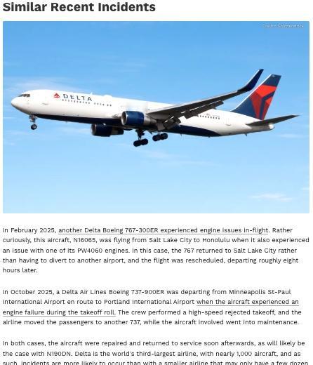 达美航空一架从檀香山飞往盐湖城的波音 767(航班 DL357)因右侧二号发动机油压下降,于 11 月 19 日清晨紧急备降洛杉矶。机组在 3.5 小时航程后接获 EICAS 警示,随即关闭发动机并发出 7700 紧急代码。飞机在 LAX 安全降落,由当地消防部门检查后自行滑行入停机位。达美随后调派一架 A319 将旅客继续送往盐湖城,剩余乘客则被改签其他航班。涉事 28 年机龄的 767 正接受维修。