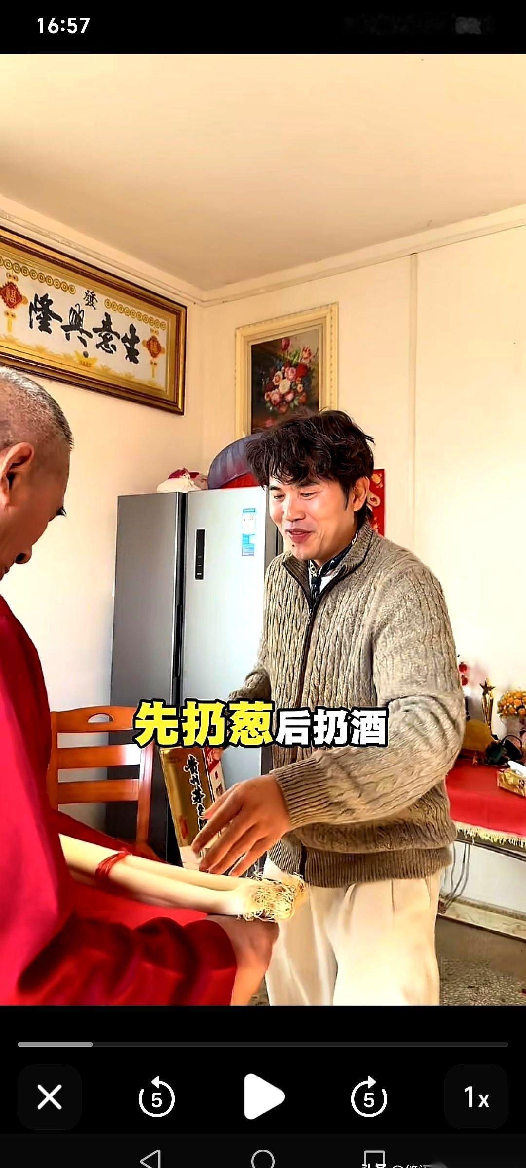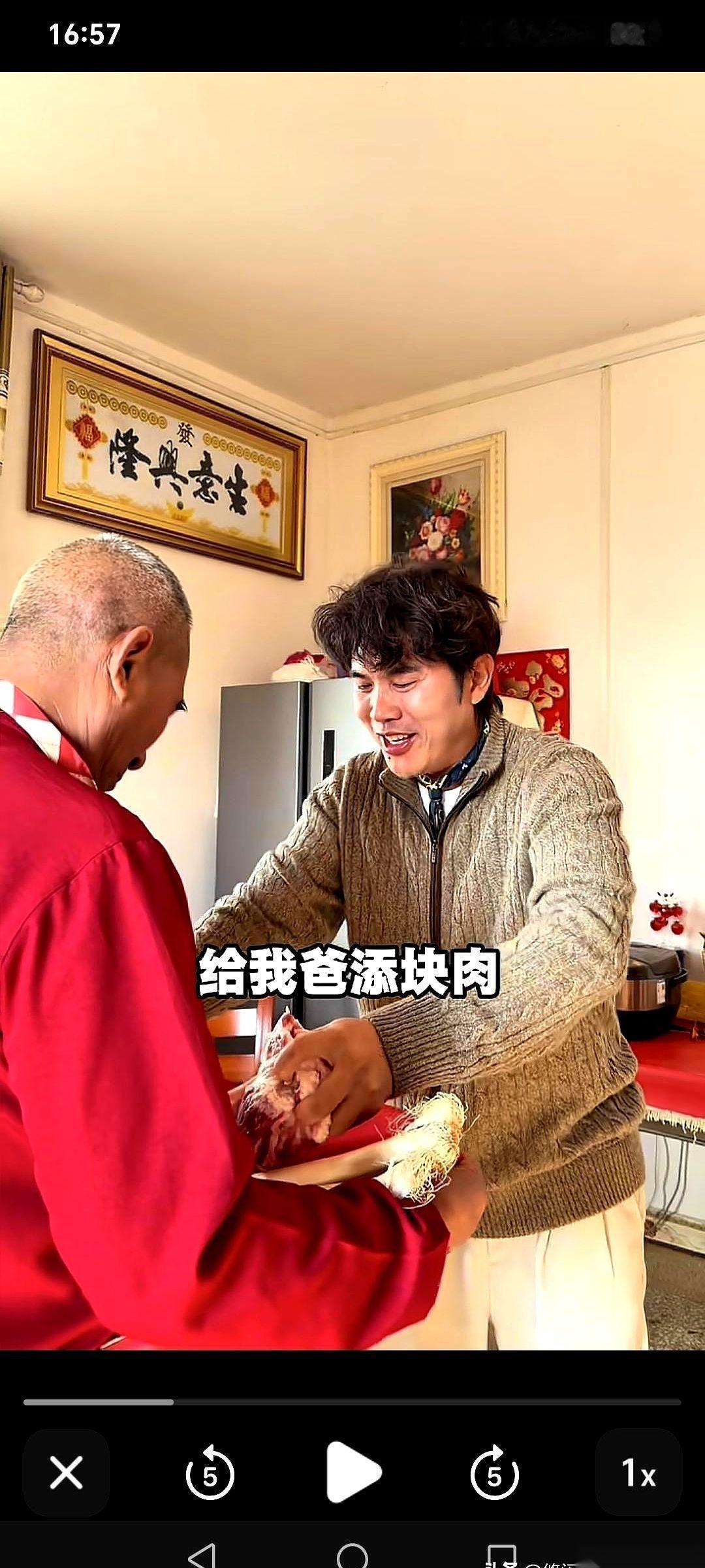 一个大男人,扑通一下,就给他爸跪下了。 脑门磕在地上,邦邦响。 说真的,刷到这儿我心都揪了一下。 什么9万9的现金,什么“冲到99岁”的葱和酒,在那一刻,全都成了背景板。 就是一个儿子,用最古老、最笨拙的方式,告诉他爸:我长大了,您辛苦了。 他爸那个表情,太真实了。 有点不知所措,有点感动,但更多的是愧疚。 嘴里念叨着:“以前在外打拼,亏欠你太多了……” 唉。 这不就是我们上一代父子的缩影吗? 父亲用缺席,换来了家里的米缸满。 儿子用出息,想换回父亲心里那点“没陪好你”的遗憾。 他给他爸脖子上系围裙,给他添肉添寿,给他一沓一沓的钱。 其实是在说: “爸,你看,你当年的辛苦都没白费。” “爸,别再觉得亏欠我了,现在换我来照顾你。” 最后那个拥抱,比什么都值钱。 一个想弥补,一个想原谅。 所有的“对不起”和“没关系”,都在那一下里了。 很多人说这是演的,是作秀。 就算是演的又如何? 我倒希望这种“秀”能多一点。起码,它在提醒我们,有些爱,再不表达就真的来不及了。