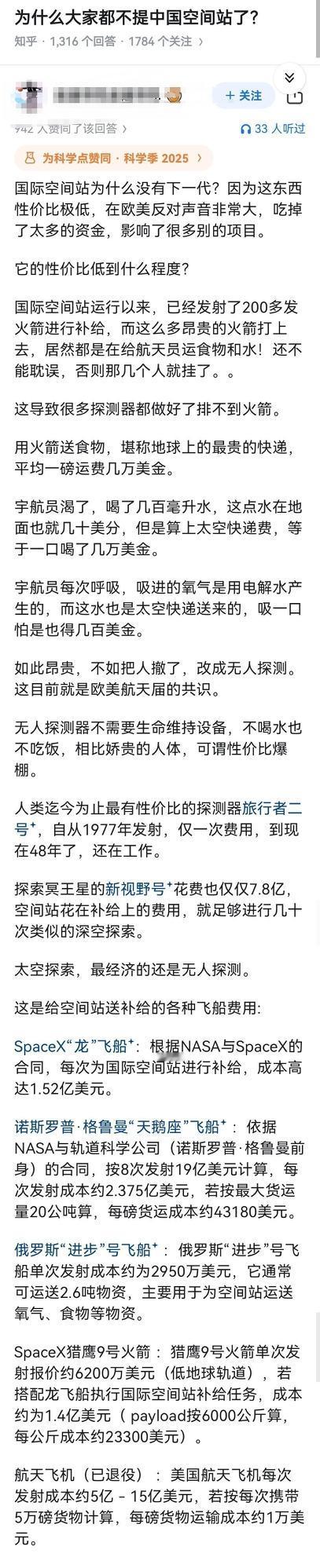 等国际空间站退役,你是不是又会说地球上的事都没完全解决,就不应该发展航空航天?一个事物热度下降,没人谈论,不外乎两个原因,一是落后了,包括但不限于不经济,不环保等。二是大家已经习惯了。现在国人中国对空间站都习以为常,和吃饭喝水一样,你会每天说今天吃了几碗饭,喝了几瓶水?而且题主有个非常明显的逻辑错误,如果欧美真的反对,认为性价比低,认为应该发展无人探测,现在做的第一件事就是把国际空间站里的人接回地球,然后让国际空间站坠毁及时止损,而不是继续往上运人运物资并且延长服役期。不是说发展无人探测不对,而是研究方向不一样。