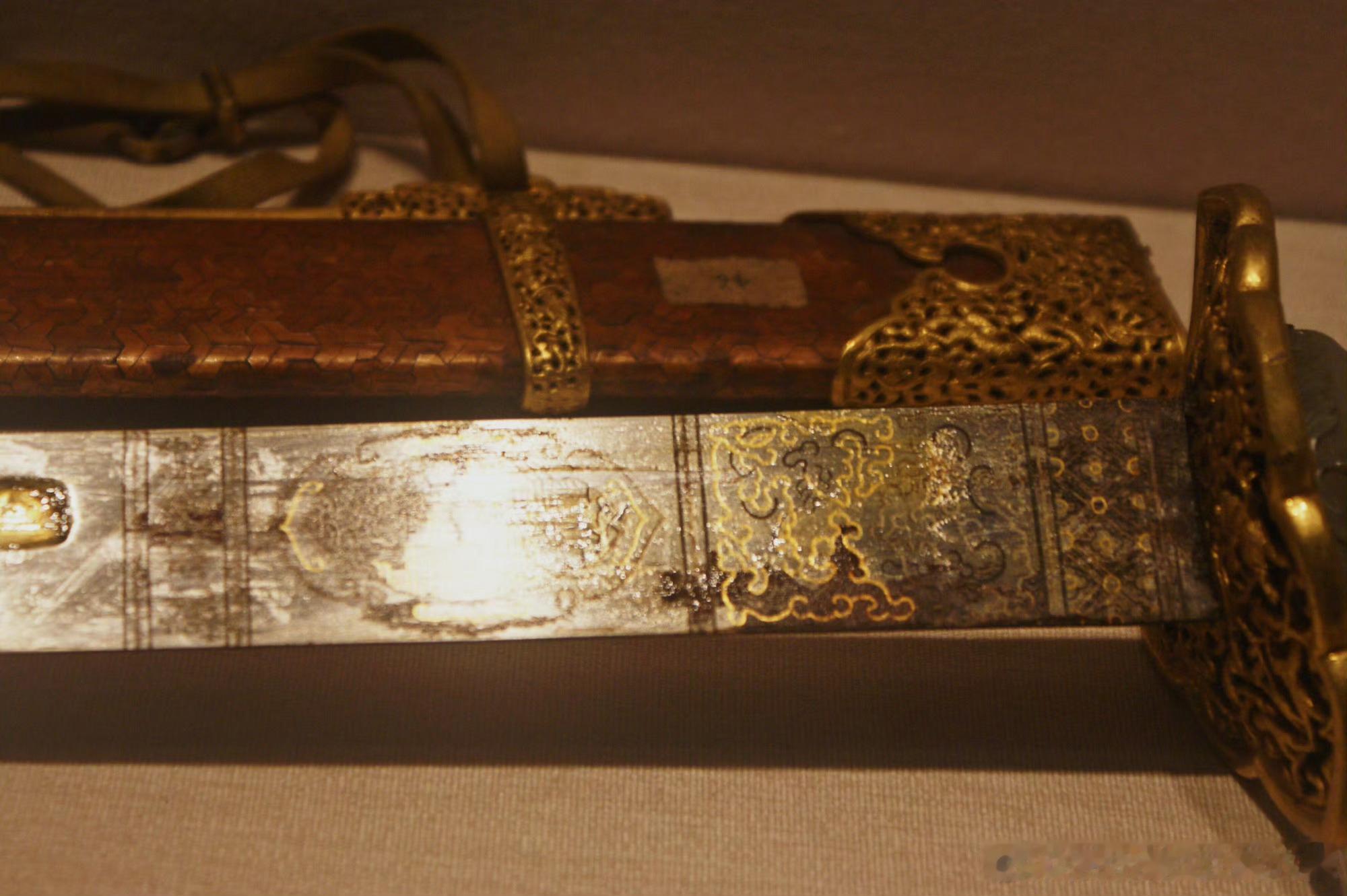乾隆大帝“天.地.人”之.息兵 这类刀条出鞘的完整照片较少。 “息兵”刀身总长约87厘米,刃宽约3.7厘米,刃厚0.9厘米,刀鞘长约82厘米,宽5.1厘米。厚1.8厘米,重1570克左右。 刀柄为和阗青白玉质,痕都斯玉风格,有明黄色穿金丝带挽线,加黑革板悬之,板饰金丝花纹(缠枝莲纹)。 刀镡为铁錽金镂空如意菱形盘,镂空雕缠枝西番莲纹,刀身钢质,刃窄而薄,有血槽,前部微曲,尖锐而锋利。吞口处镶嵌金、银、铜组成图案,分四段,以金、银、铜镶嵌的三道横线相隔,一面隶书“X字Xx号”,菱花形开光内为刀铭“息兵”双夔龙纹及楼台亭阁纹。另一面为隶书“乾隆年制”与刀名对应的形象图案、双夔龙纹及几何抽象的云雷纹。 刀鞘木质饰以金桃皮,琒、珌(鞘口、鞘尾)皆铁錽金镂空龙纹(穿枝龙纹),横束铁錽金箍二道,鞘背为铁錽金镂空(缠枝莲纹)提梁,提梁束铁錽金镂空龙纹(穿枝龙纹),系明黄色绦带与铀镀金环相属,是为佩挂之用。 “息兵”刀保存状况相当好,基本保持了原貌。