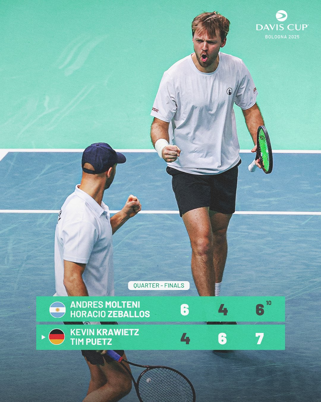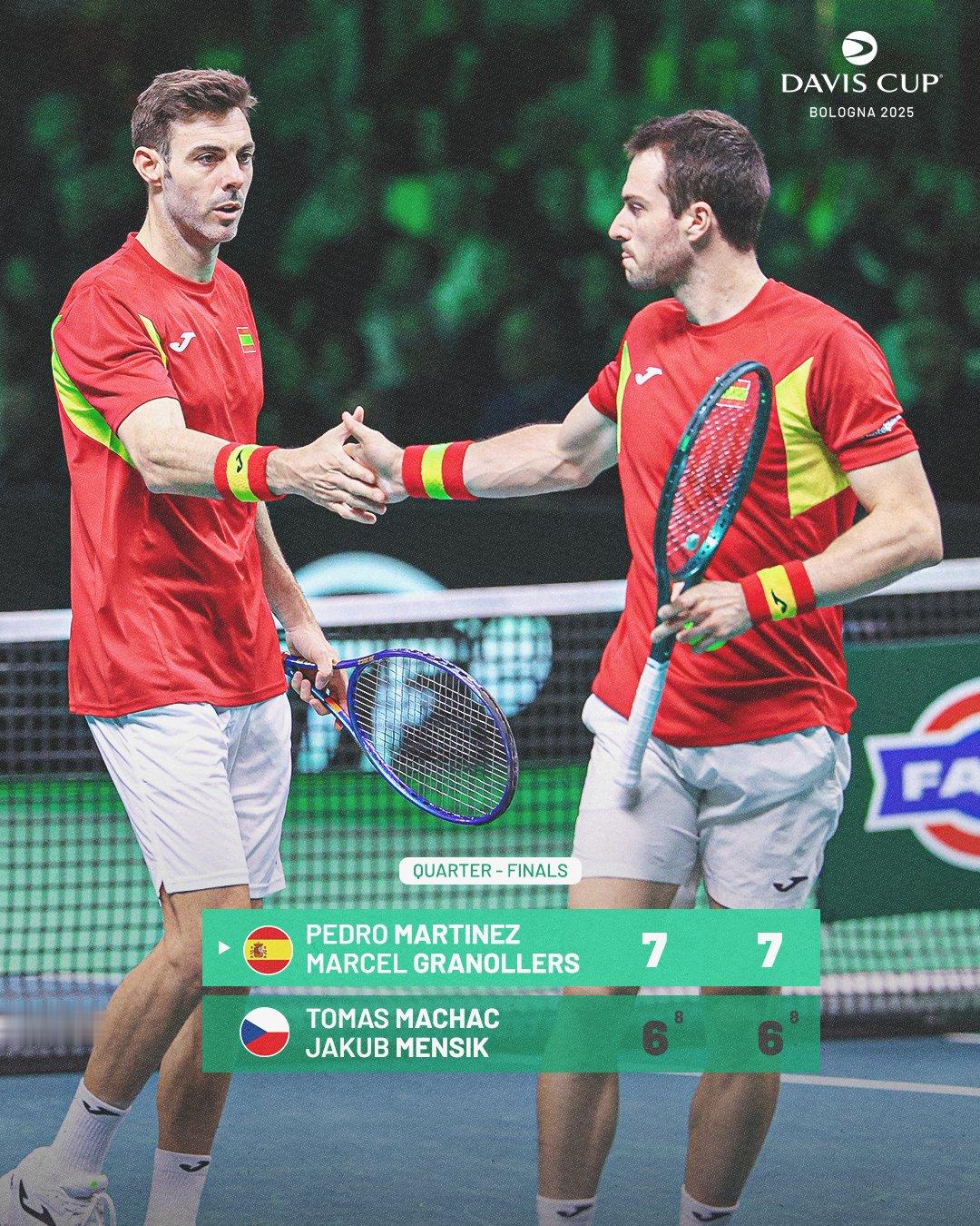 总决赛 最后两场1/4决赛:西班牙2-1逆转捷克布斯塔不敌门希克穆纳尔击败莱赫奇卡扳平比分西班牙组合双打锁定胜局德国2-1逆转阿根廷施特鲁夫不敌埃切维里兹维列夫击败塞伦多洛扳平比分双打德国组合三盘险胜!半决赛对阵:意大利vs比利时西班牙vs德国