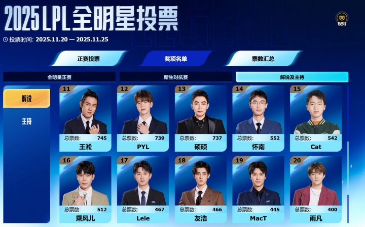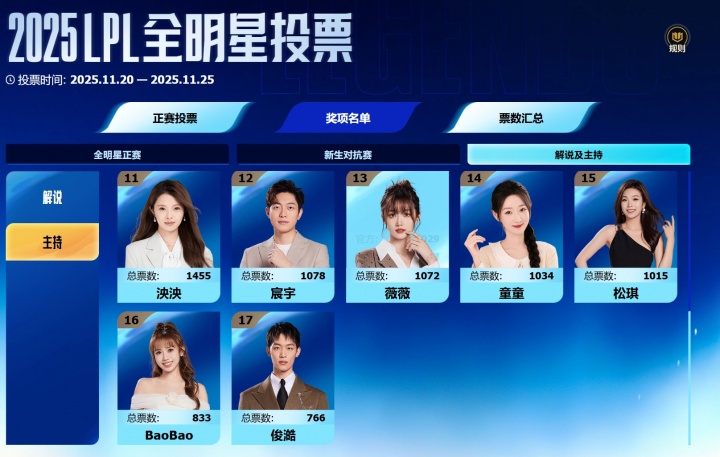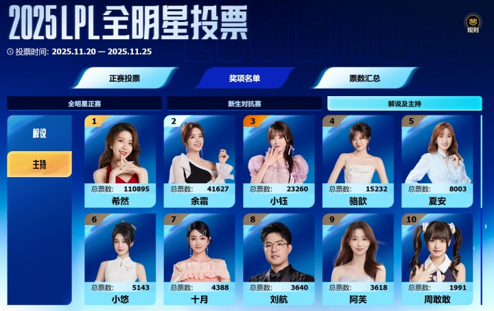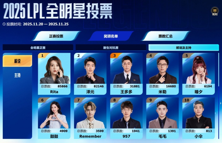 直播吧11月21日讯 2025LPL全明星投票已经开始,,经过一日的投票,目前最佳解说Rita小幅度领先管泽元,并且两人与其他解说拉开断层差距。