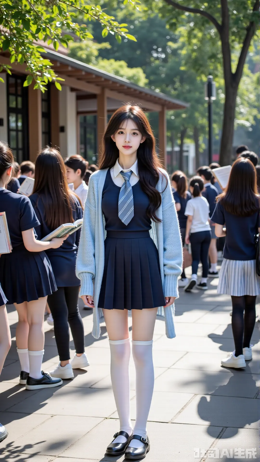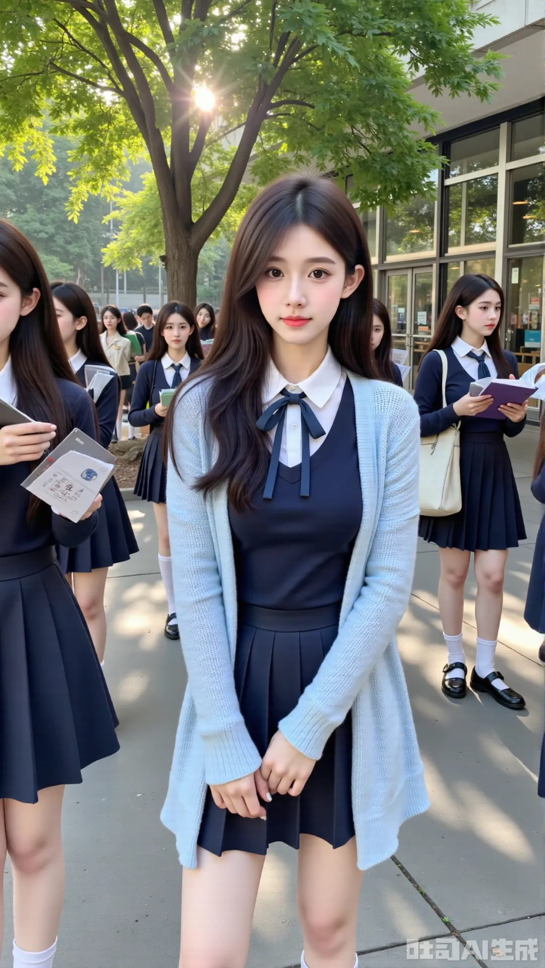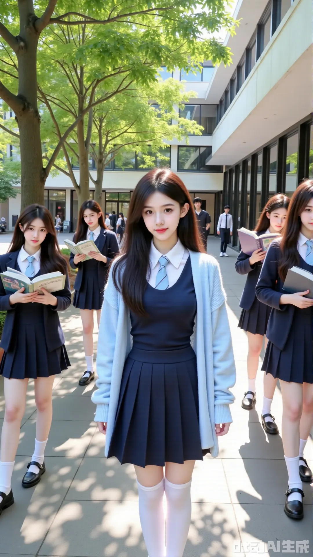 青春校园风,少女们手捧书本,漫步在阳光下的校园。