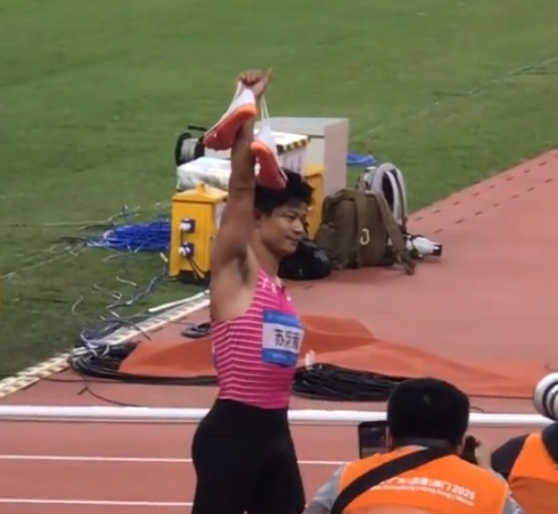 据博主“是周川呀”社媒消息,赛后苏炳添将跑鞋鞋带系起后高高举起,示意自己“挂靴”。