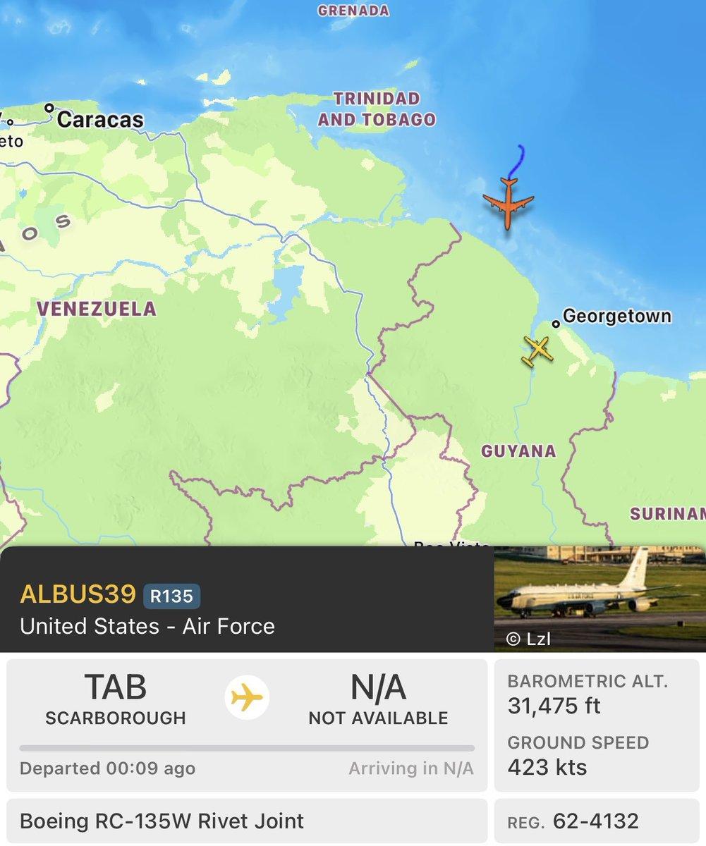 🚨🇺🇸🇻🇪美国侦察机在圭亚那-委内瑞拉边境低空盘旋,此前两国因石油资源丰富的埃塞奎博油田而关系日益紧张。 一架美国空军 RC-135W“铆钉联合”信号情报飞机被发现在圭亚那海岸附近飞行,靠近与委内瑞拉接壤的长期存在争议的埃塞奎博地区。 “铆钉联合”号不是一架普通的巡逻机,而是一种高空电子窃听器,用于拦截军事通信、雷达辐射和战略信号。 它的出现强烈表明,华盛顿正在积极实时监控委内瑞拉的军事态势。 时机并不微妙:委内瑞拉加大了对埃塞奎博地区的威胁力度,该地区石油、天然气和矿产资源丰富,委内瑞拉声称该地区是其领土;而圭亚那在国际法和埃克森美孚的支持下,则坚持己见。 加拉加斯于 2023 年 12 月 3 日举行了一次咨询性全民公投,以加强其对埃塞奎博的主权声索。此举遭到圭亚那的谴责,并受到美国国务院的批评,认为此举破坏了圭亚那的领土完整。 如今,美国在空中部署了监视力量,传递的信息很明确:美国不只是在监视……它还在天空中划定界限。 来源: @sentdefender南美委内瑞拉 委内瑞拉石油战 委瑞瑞拉局势 阿根廷委内瑞拉 委内瑞拉地图 委内瑞拉主权 委内瑞拉战备