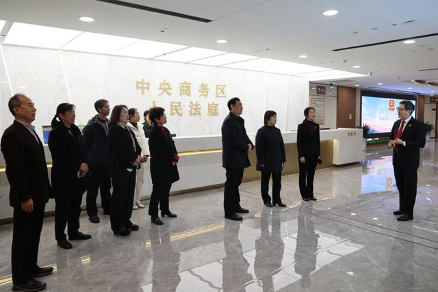 调研组实地查看了中央商务区法庭诉讼服务中心、审判区、金融多元解纷区、法官办公区,详细了解法庭在金融纠纷源头治理、审判执行管理、府院联动、党建引领以及代表委员联络等方面的创新做法,并现场展开深入交流。