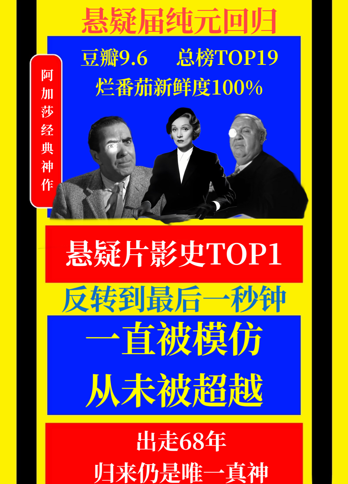 朋友们阿婆粉狂喜!!!.盼星星盼月亮终于盼来了!影史高分悬疑神作《控方证人》内地定档12月5日并同步开启预售!!!导演比利·怀尔德✖阿加莎·克里斯蒂时隔68年强势回归大银幕!熟悉的悬疑推理味儿又回来了!一次横跨半个多世纪的激烈庭审交锋,一场不看到最后绝对猜不到结局的惊天谋杀案,男人沃尔被指控谋杀富婆,走投无路之下求助律师威尔弗里德爵士为其辩护脱罪,妻子克里斯汀则作为控方证人出席庭审为丈夫作证,法庭之上,案件扑朔迷离难辨黑白,面对步步紧逼的对峙局面,众人会在智谋、心理、精神等全方位的交锋下做出各种抉择?斗智斗勇的反转大戏、激烈高能的庭辩风暴,严丝合缝的法理逻辑输出,更有周野芒、宋忆宁、刘风、乔榛等一众上译厂配音大师来为角色添砖加瓦,堪称译制天花板。好好好,这波搞得我鸡皮疙瘩都掉一地了,看来是做好准备来给内娱放必杀招了!!12月5号赶紧吻上来🤩这把悬疑神片我必狠狠冲!