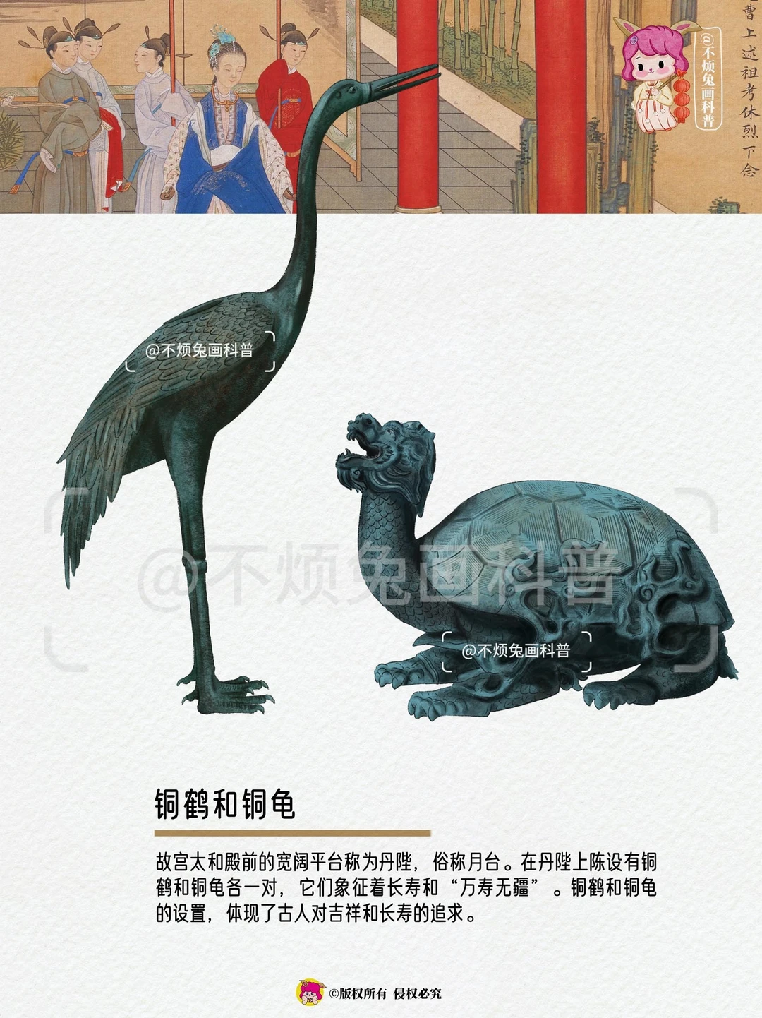 故宫太和殿前的宽阔平台称为丹陛,俗称月台。在丹陛上陈设有铜鹤和铜龟各一对,它们象征着长寿和“万寿无疆”。铜鹤和铜龟的设置,体现了古人对吉祥和长寿的追求。