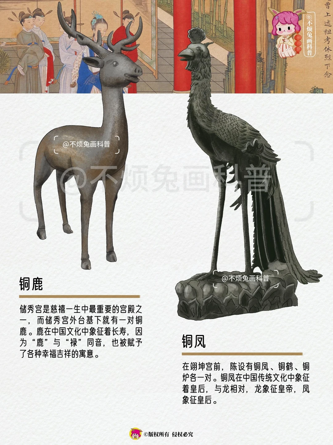 储秀宫是慈禧一生中最重要的宫殿之一,而储秀宫外台基下就有一对铜鹿。鹿在中国文化中象征着长寿,因为“鹿”与“禄”同音,也被赋予了各种幸福吉祥的寓意。