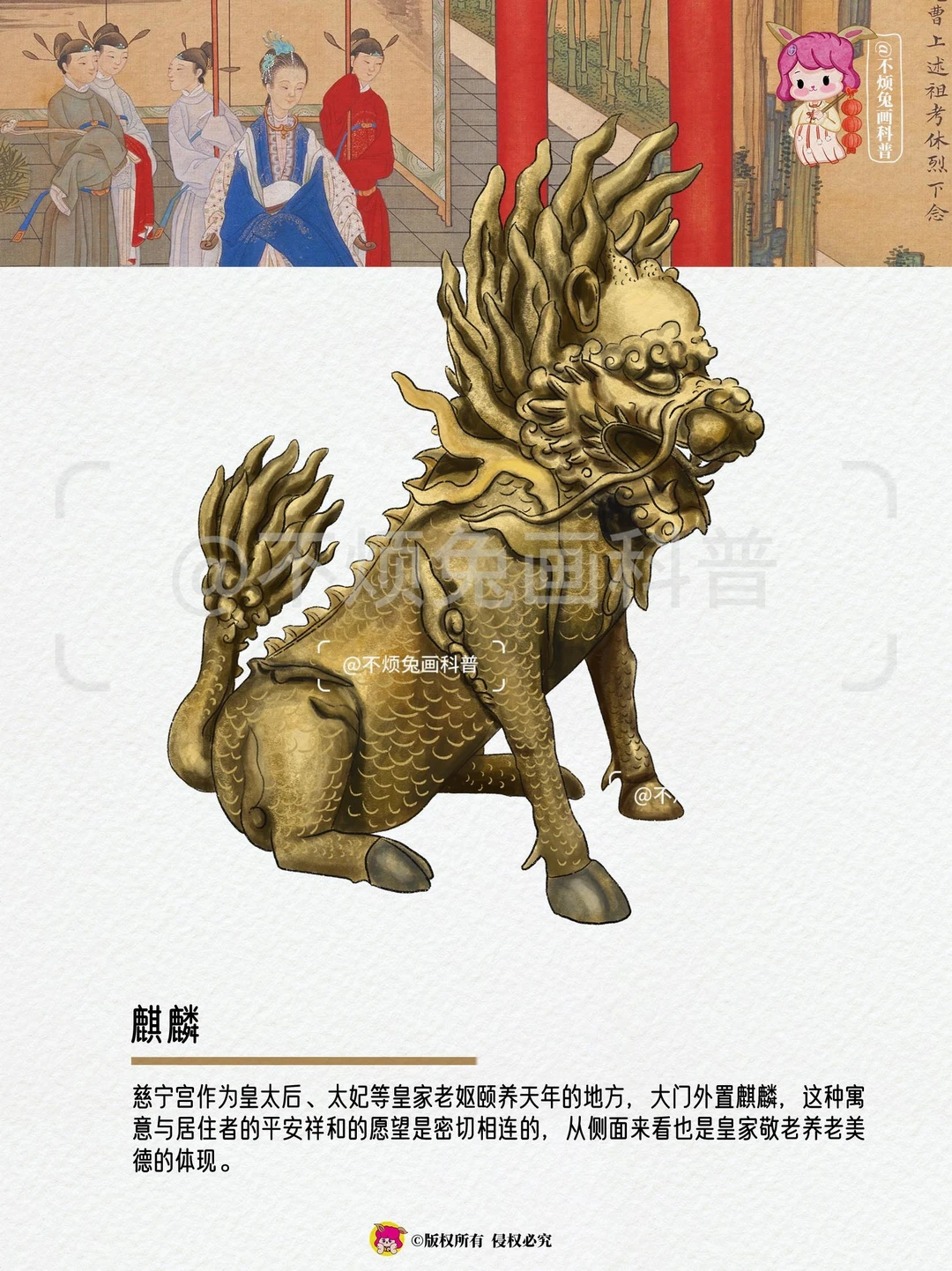 慈宁宫作为皇太后、太妃等皇家老妪颐养天年的地方,大门外置麒麟,这种寓意与居住者的平安祥和的愿望是密切相连的,从侧面来看也是皇家敬老养老美德的体现。