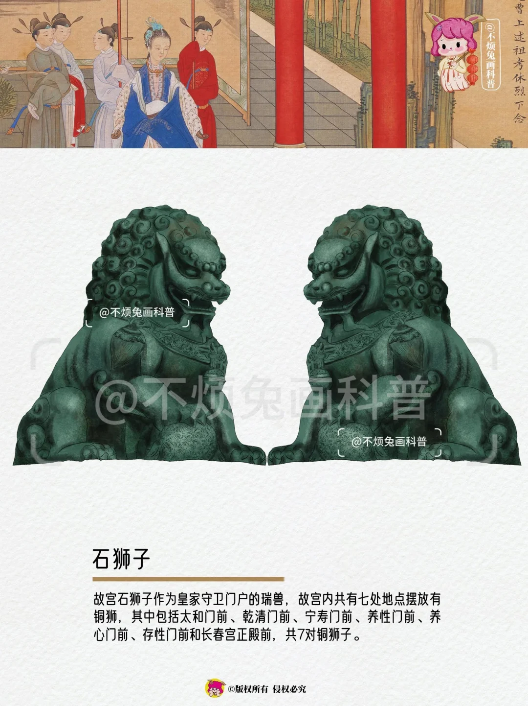 故宫石狮子作为皇家守卫门户的瑞兽,故宫内共有七处地点摆放有铜狮,其中包括太和门前、乾清门前、宁寿门前、养性门前、养心门前、存性门前和长春宫正殿前,共7对铜狮子。