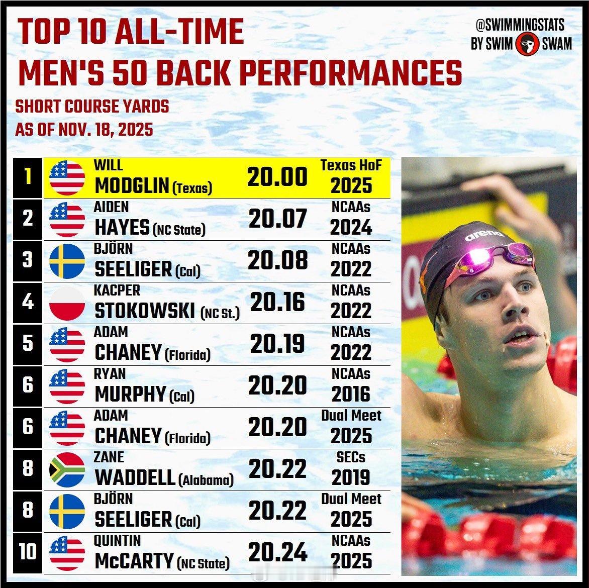 🇺🇸Will Modglin 43.26 打破100码仰泳全美纪录,历史第三快选手此前在接力开棒50码仰泳成绩20.00成为该距离历史最快成绩(50码仰泳NCAA不设单项和纪录)今年上半年选拔赛发挥一般没有选上世锦赛,但是在后面大运会52.54游出今年美国百仰最快成绩,成功入选明年本土泛太平洋锦标赛