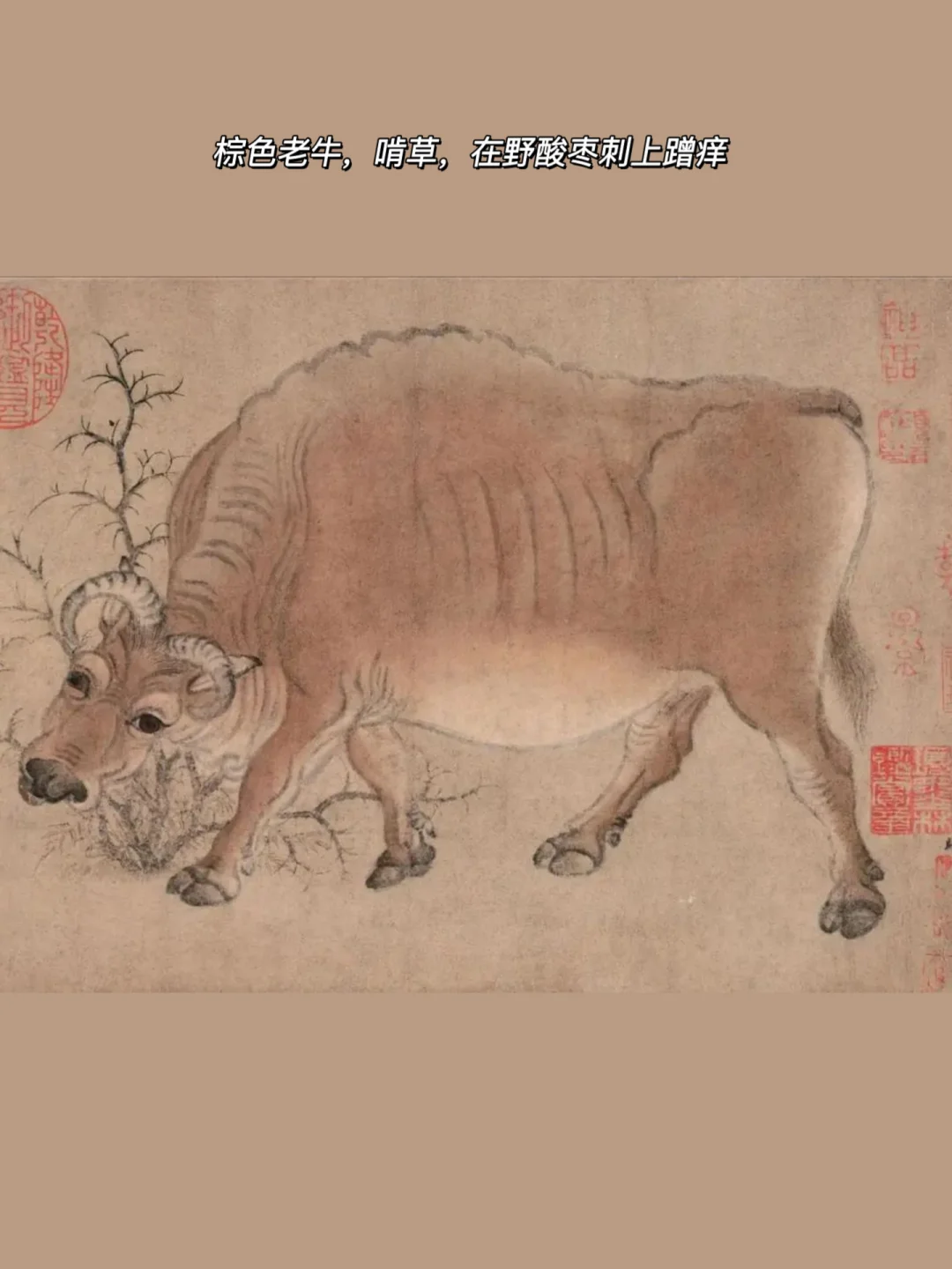 🐮从左至右我们可以看到,第一头棕牛以淡墨勾勒轮廓,浅赭渲染牛身,牛腹留白突出量感,只见他一边啃草,一边在野酸枣刺上蹭痒,显得悠闲自得。