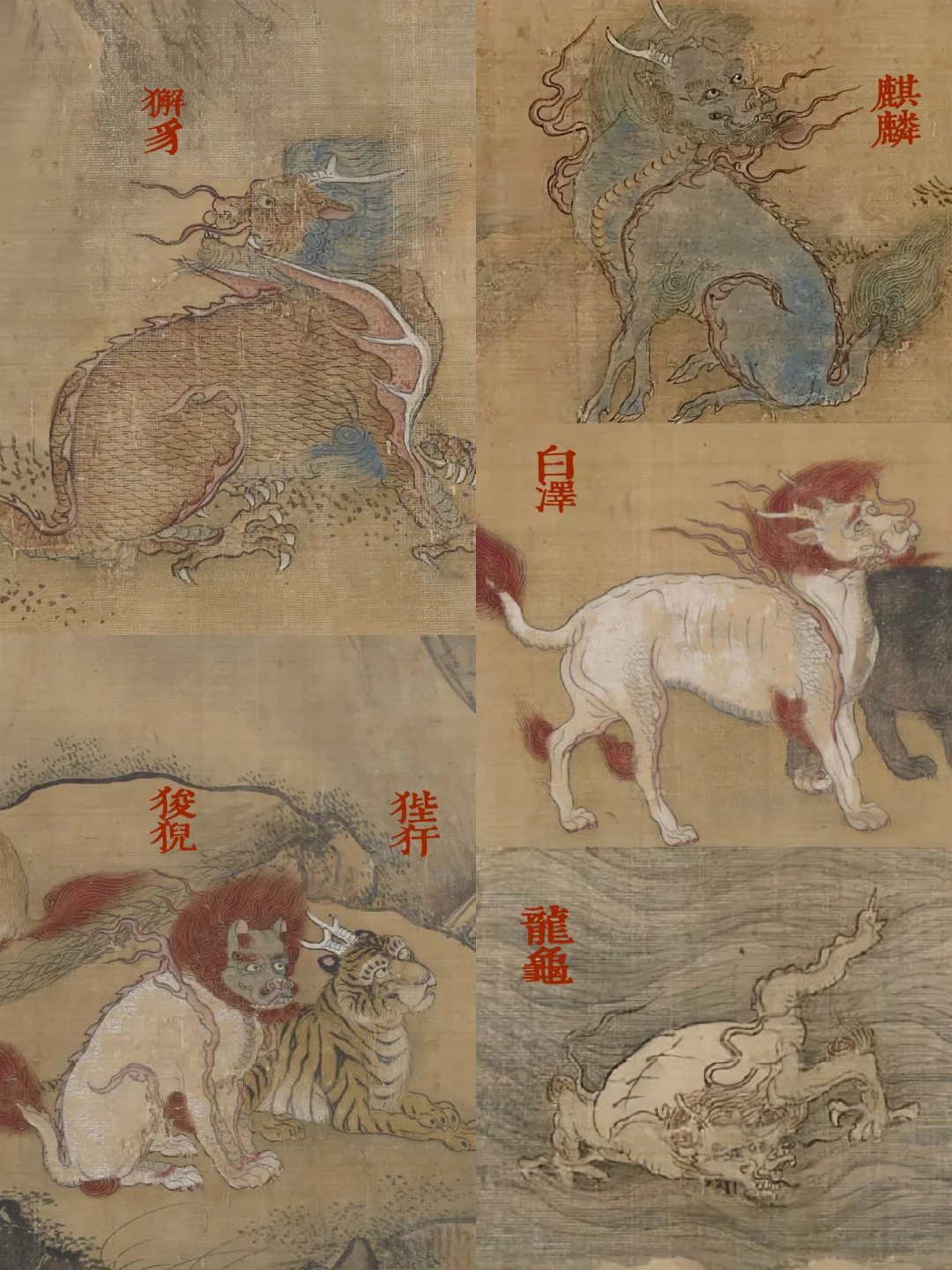 狻猊为龙第五子,形似狮子;狴犴为龙第七子,貌如老虎;麒麟为应龙后代,有祥瑞之兆;白泽生龙头朱发,晓天下万物。