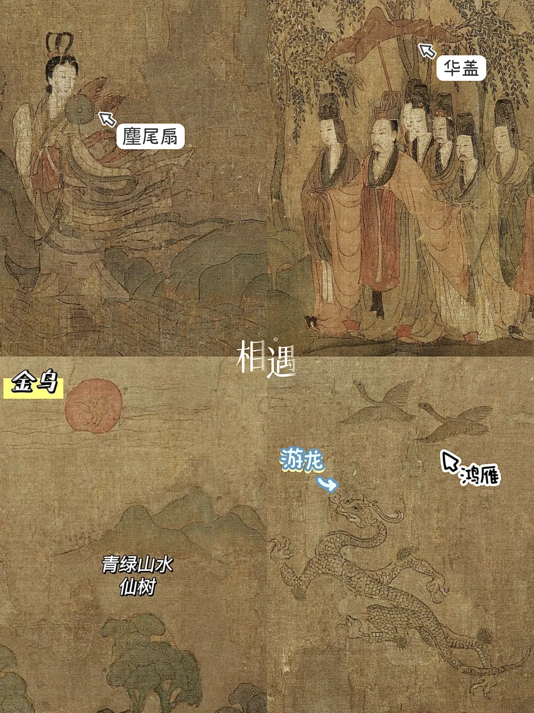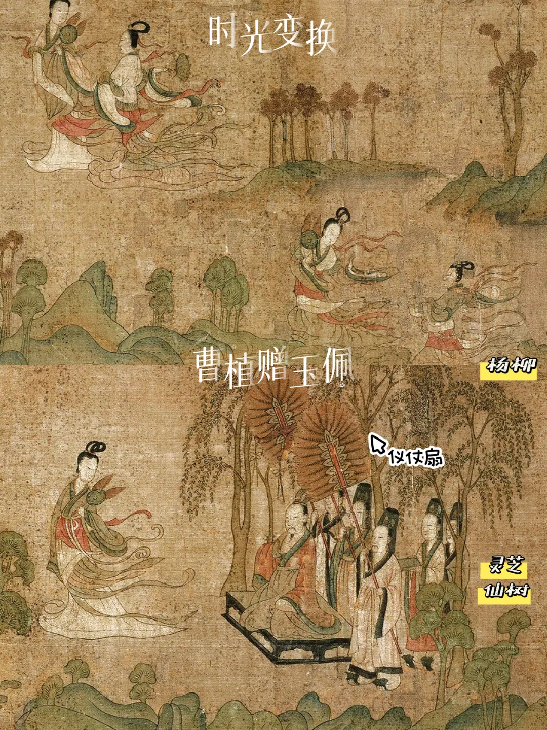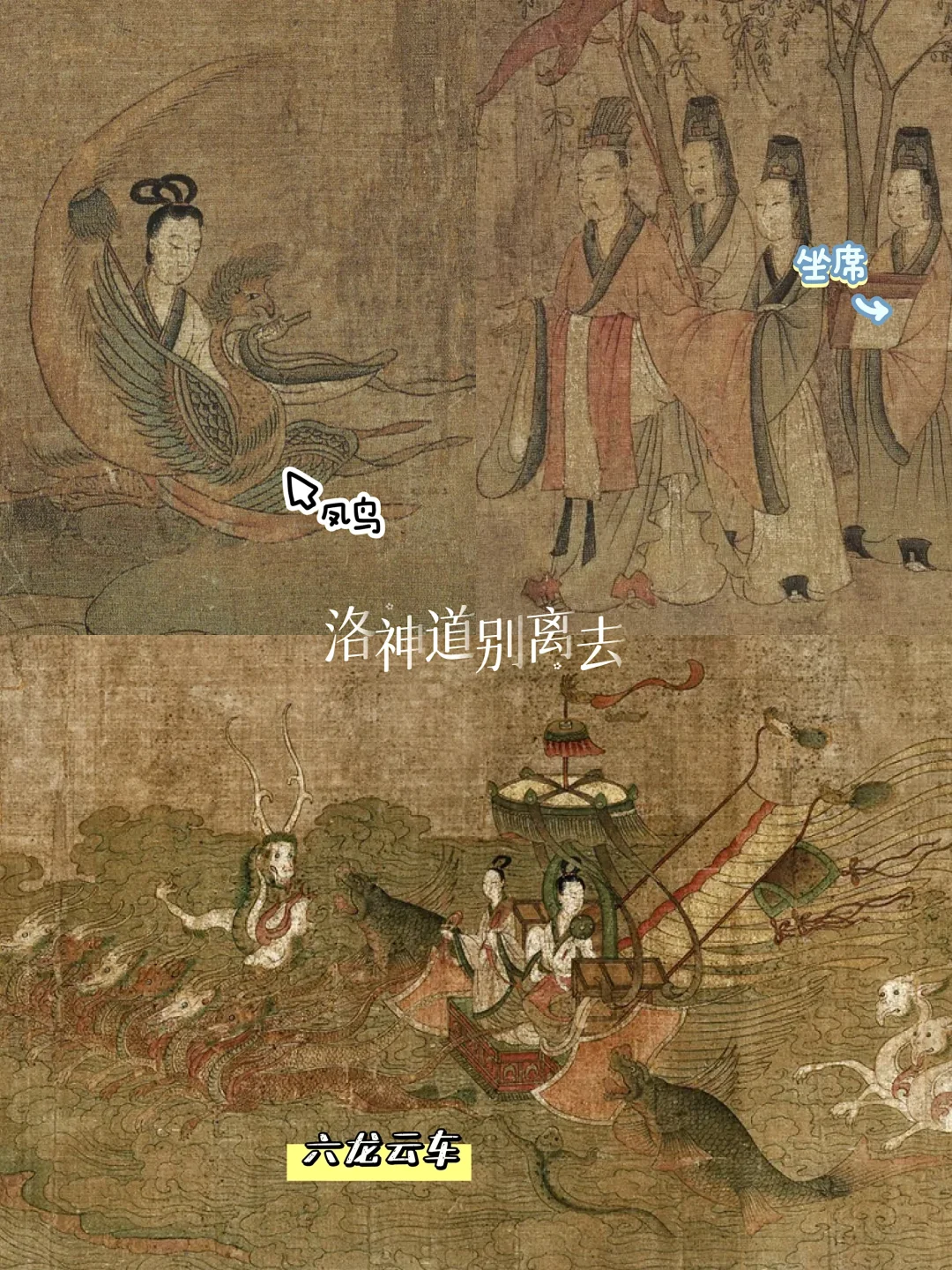 🌊这幅画源于曹植所作的《洛神赋》,除了题材新颖,艺术风格也很鲜明,它采用连环画手法,将不同空间的故事串联在一起。
