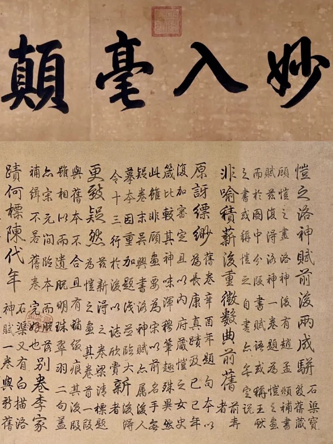 🌊其中,故宫版本因画风保留六朝遗韵而被更多世人研究。当我们展开近6米长卷,先映入眼帘的是乾隆及内府大臣题识。